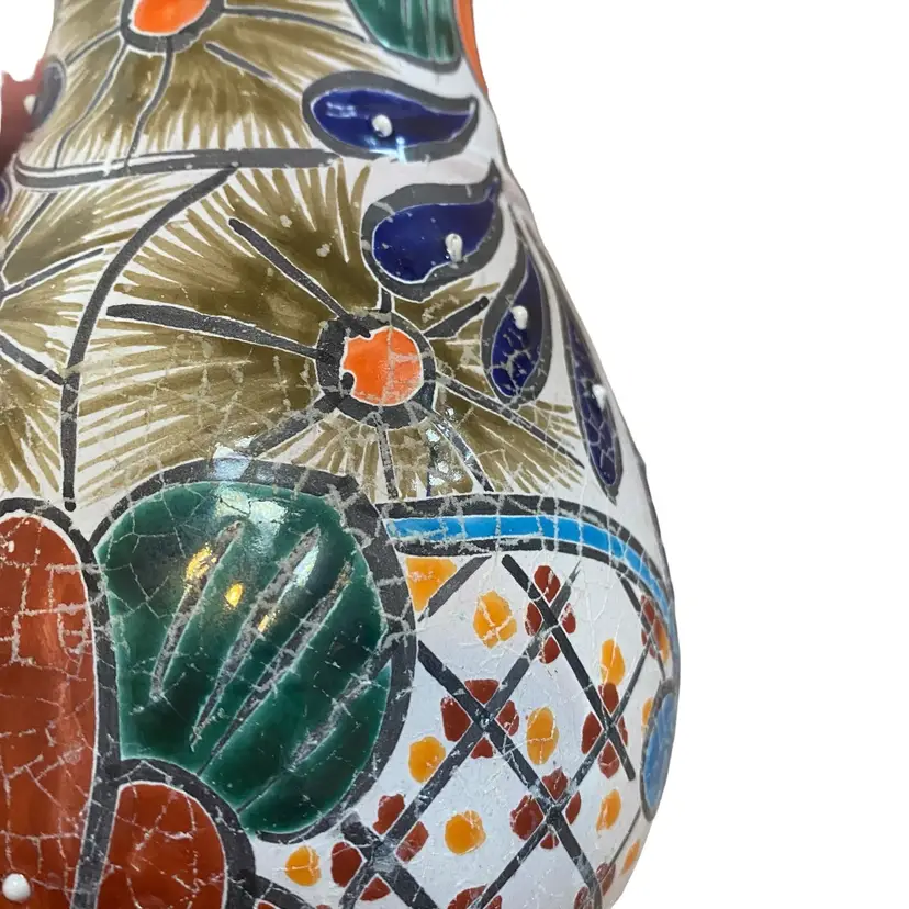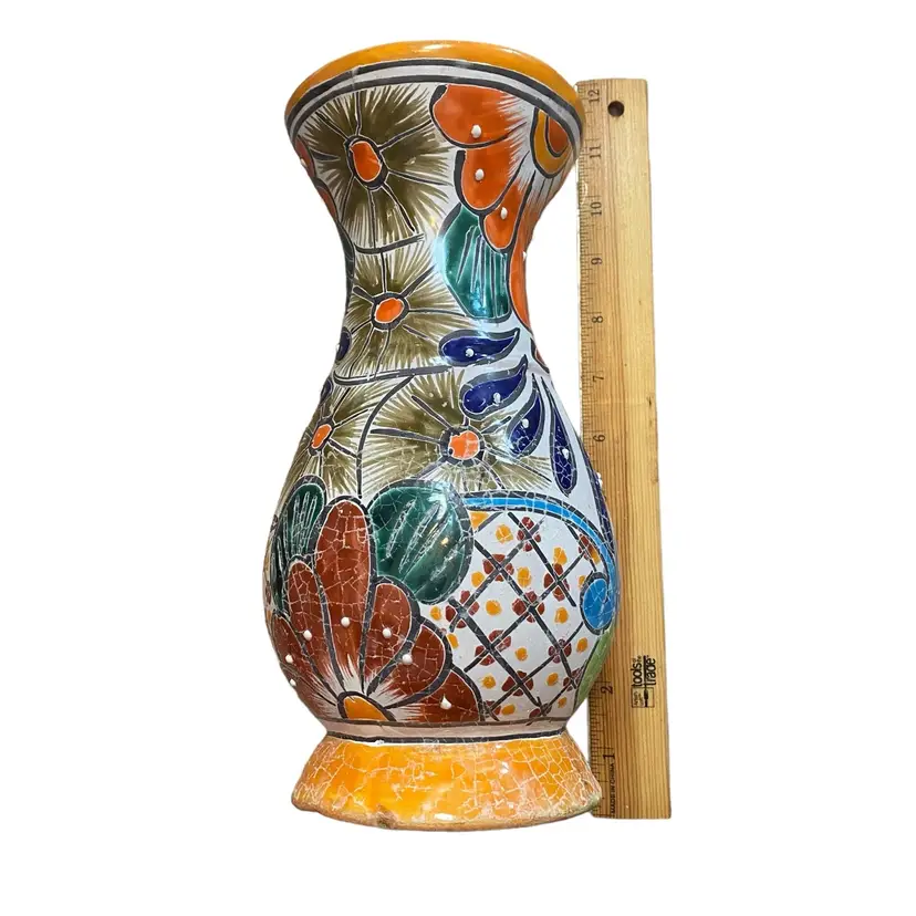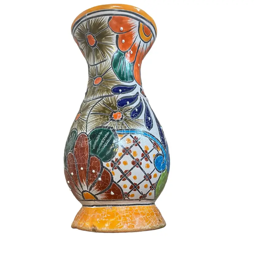 Mexico Mexican ceramic pottery vase orange blue 11in crackled and raised paint.