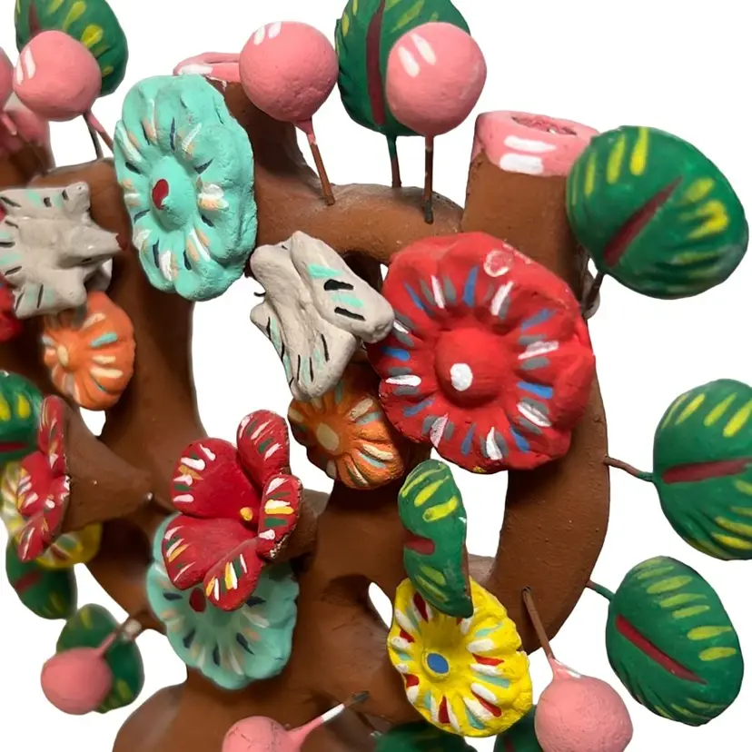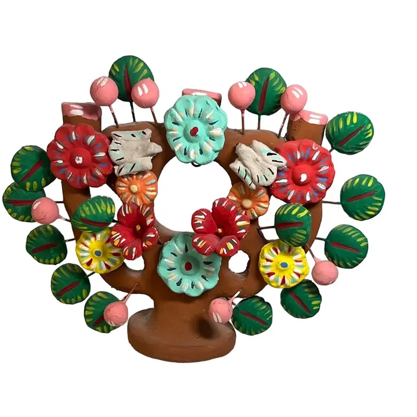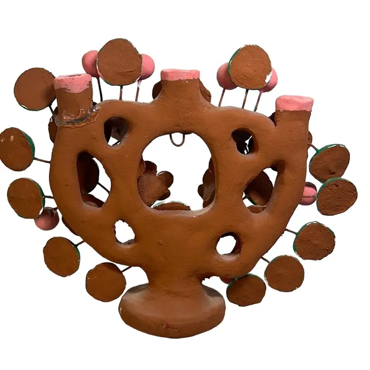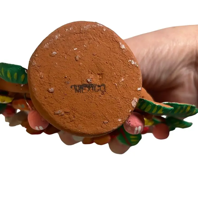 Colorful flowers and birds Stamped Mexico NOTE: One of the candle holders looks to be repaired. No chips or cracks otherwise.