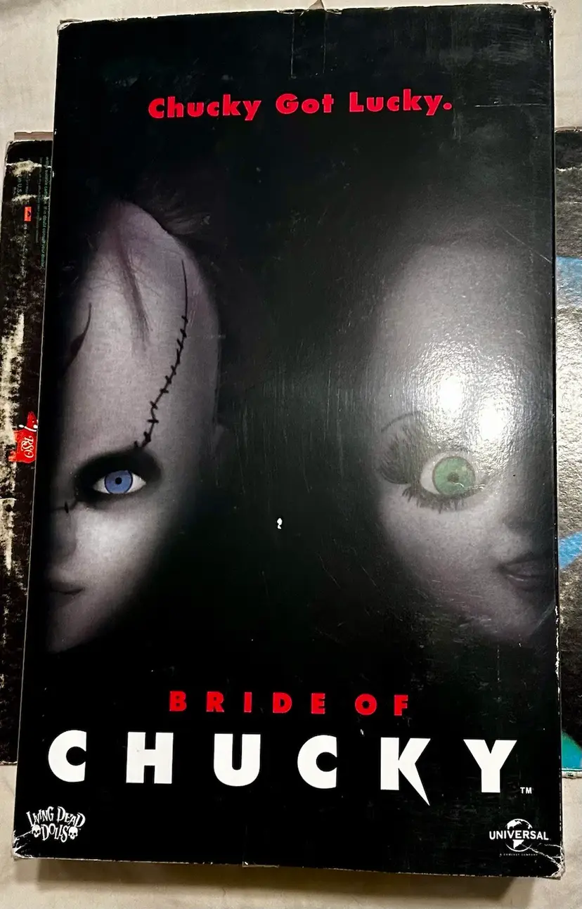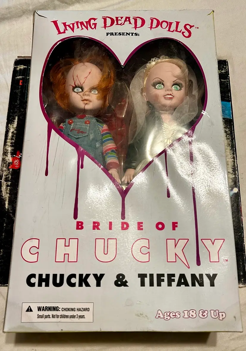 Mezco Living Dead Dolls Chucky and Tiffany Dolls. Face of box is very faded and is a gray color and should be yellow. Front clear window is compromised.