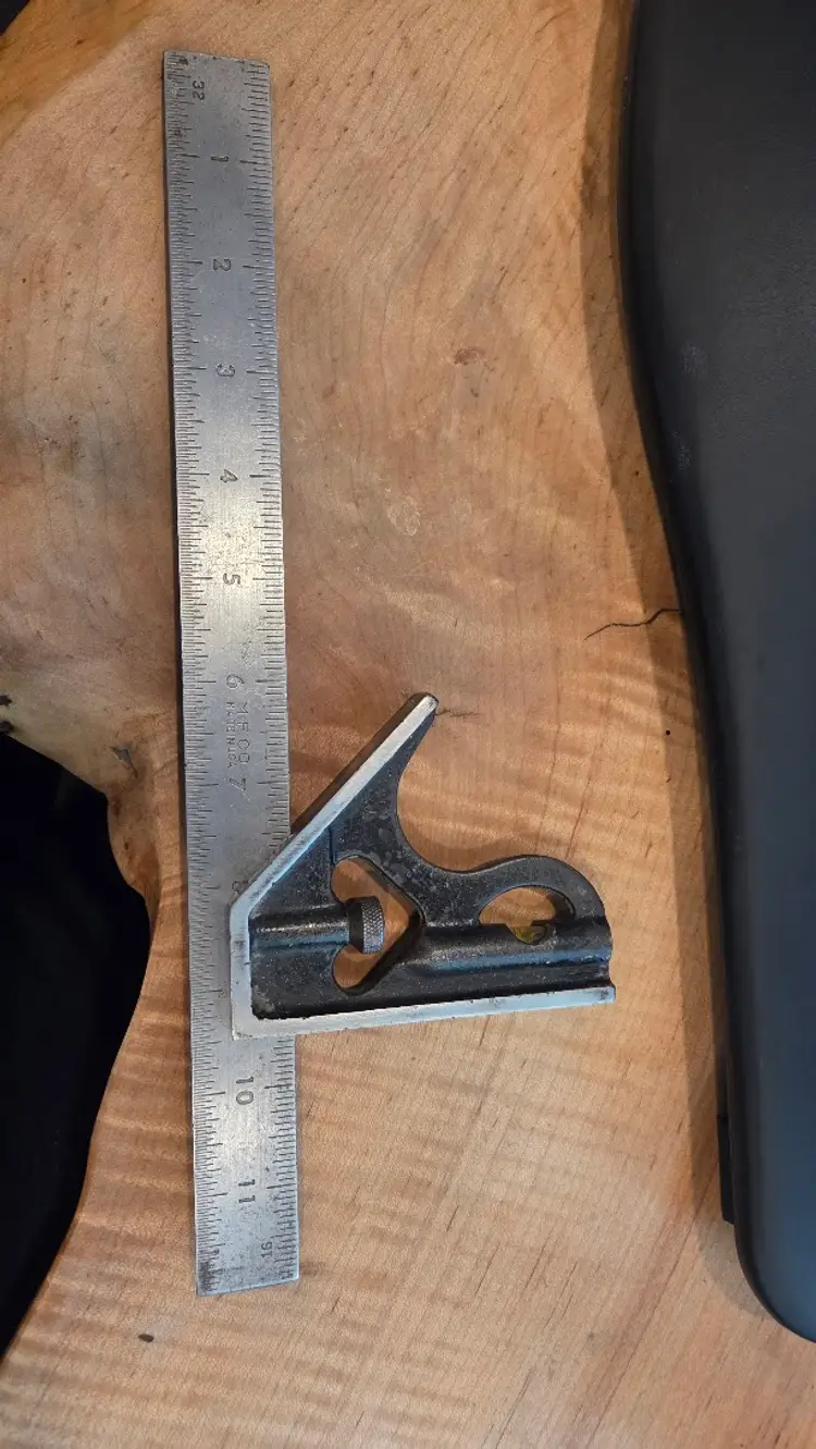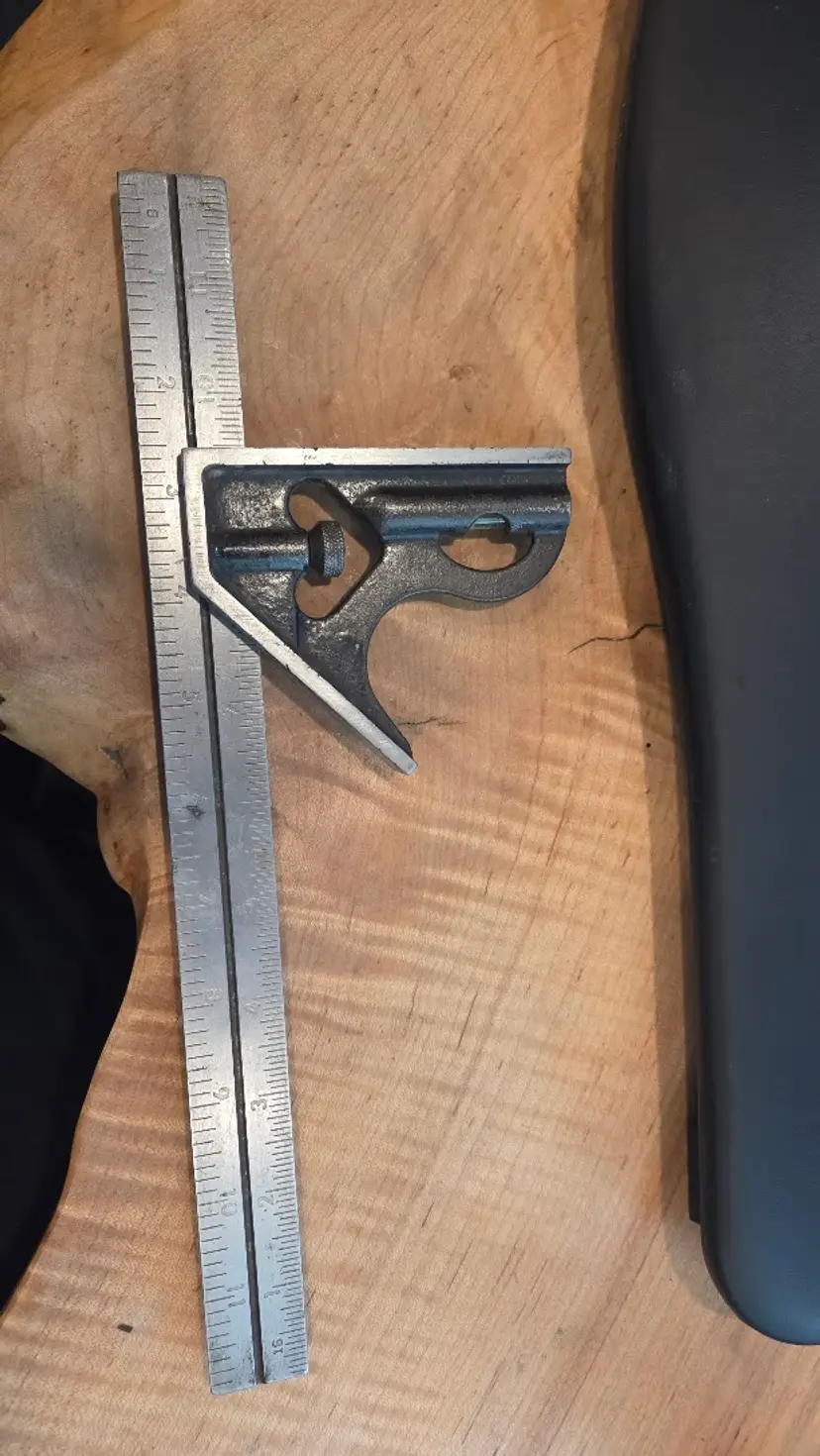Nice hardened steel made in USA combination square, comparable to Starrett. Slides smooth and is square. Missing the scratcher. 12" long ruler