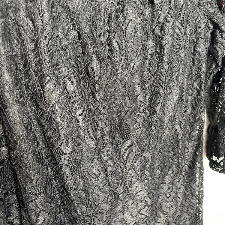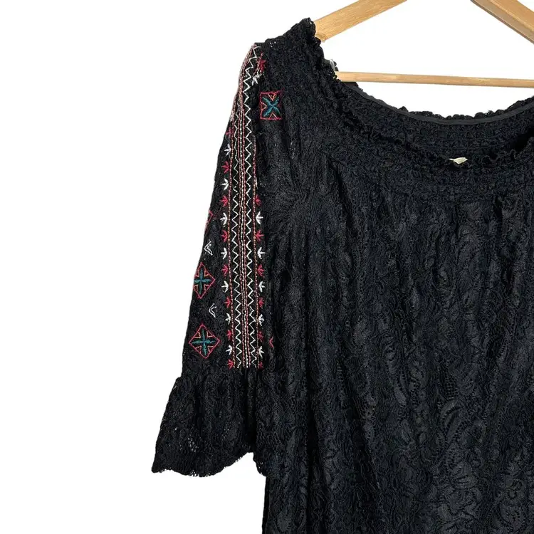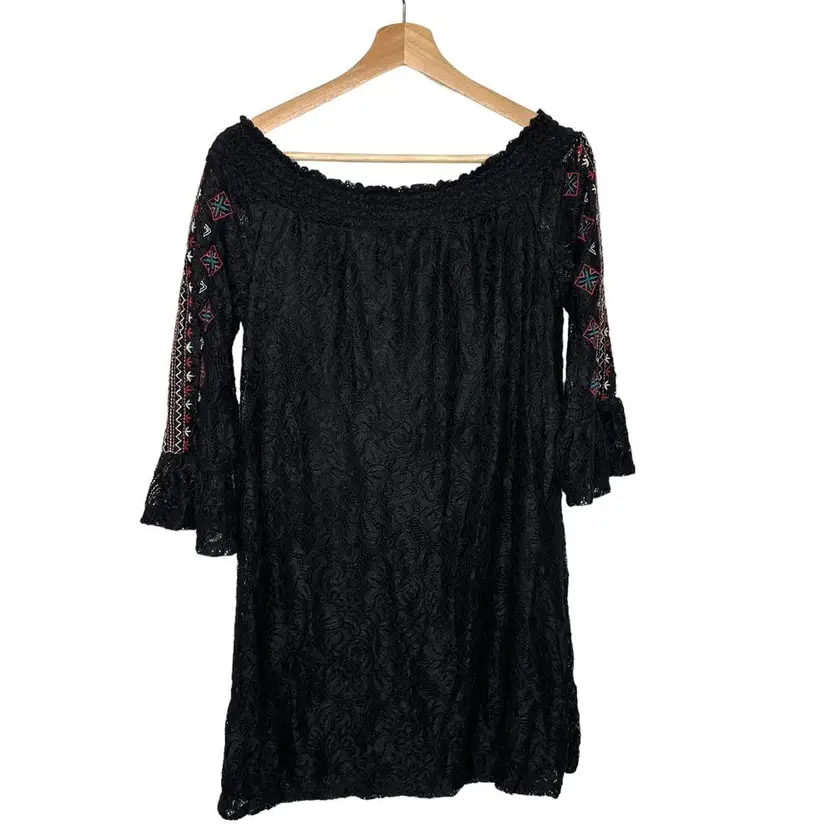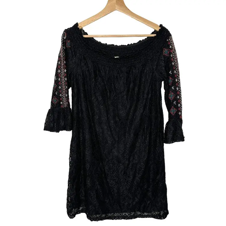 Mi Ami Francesca's Black Withy Boho Lace Dress Whimsygoth, goth, dark romance, Stevie Nicks, retro, boho Lace with Aztec pattern on sleeves, bell sleeves New with tags, women's Medium Mini dress, baby doll style Scoop neck