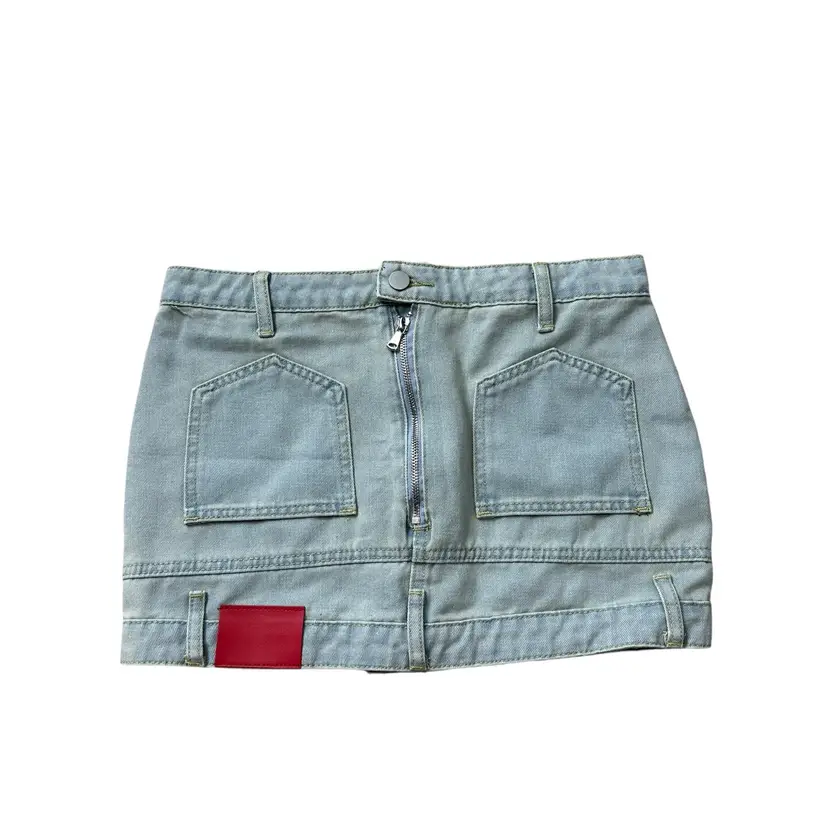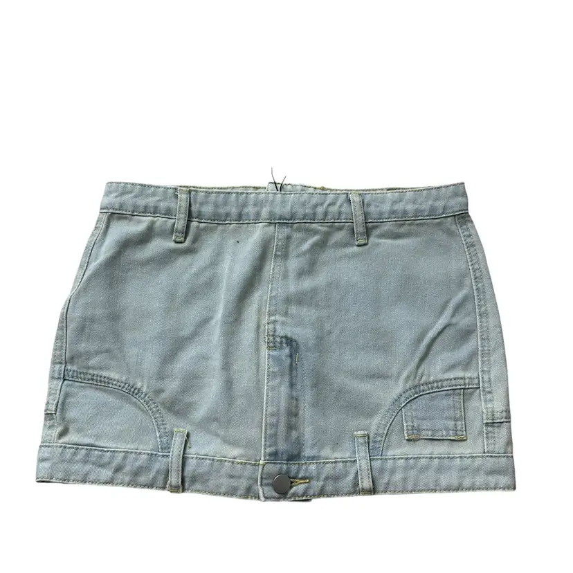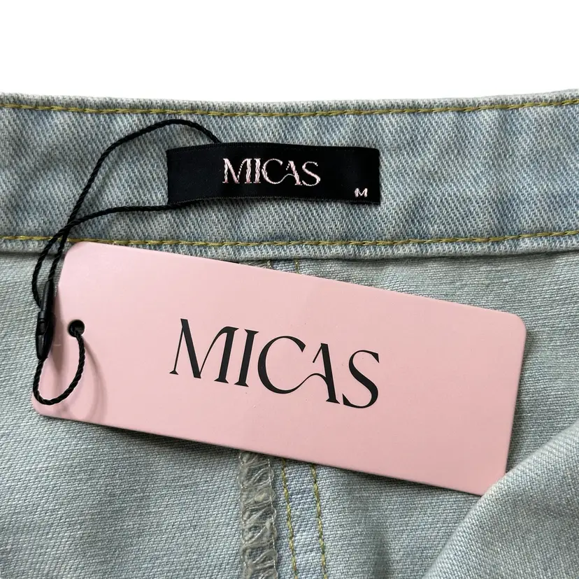 Micas Upside Down Denim Jean Skirt Mini Medium New With Tags Unique skirt made from jeans turned upside down Indie, unique, grunge, casual, denim, trendy Waist: 30 in Length: 12 in mini above knee Material: Cotton blend