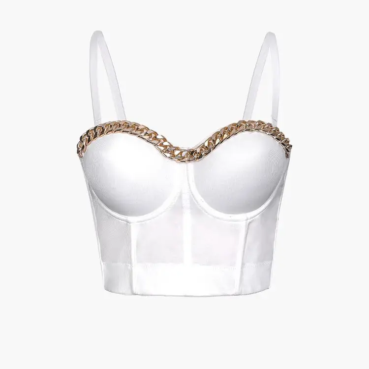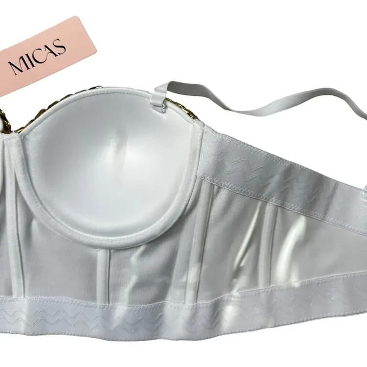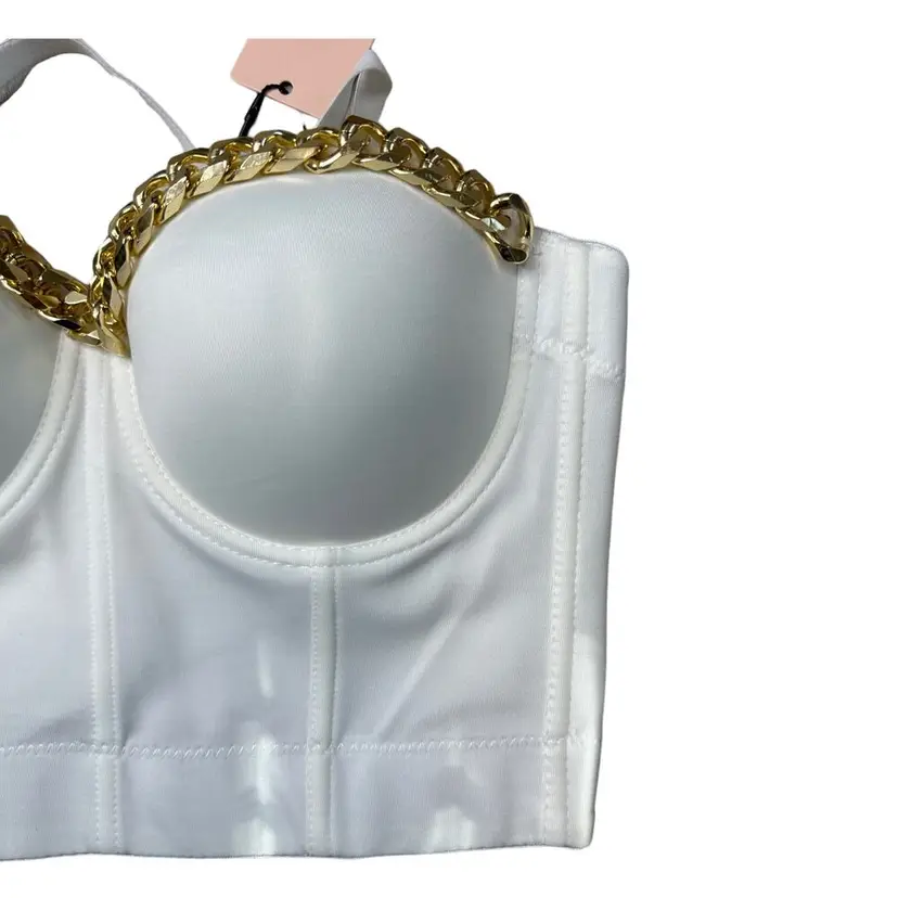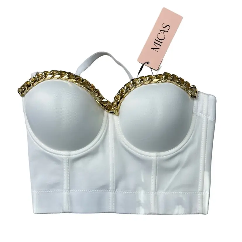 Micas White Gold Chain Detail Corset Bustier Top NWT Large Standard large with adjustable sizing in back pushup bra cup sizes A-C polyester and spandex Gold chain detail Fancy, glam, party, girl's night out, dancing, date night, ballet, fairy