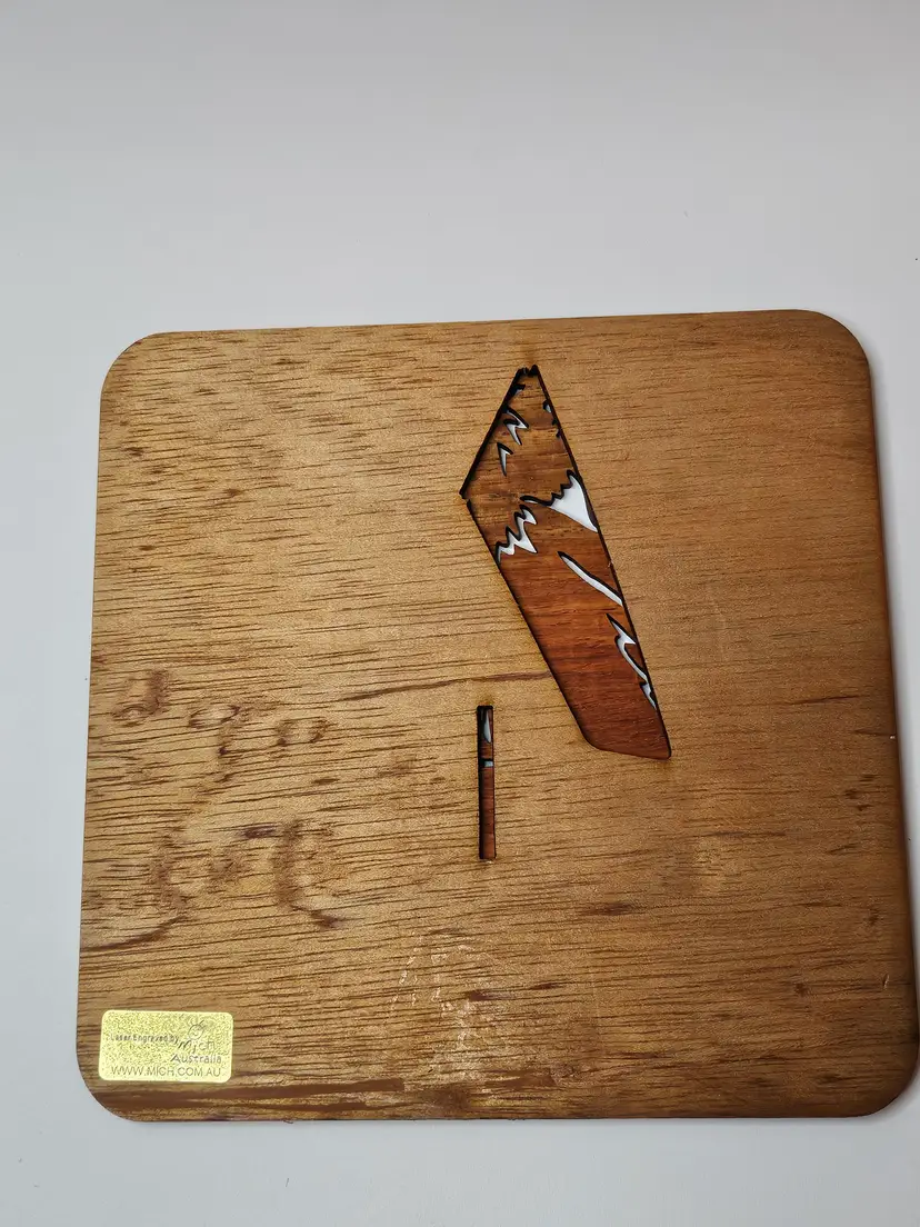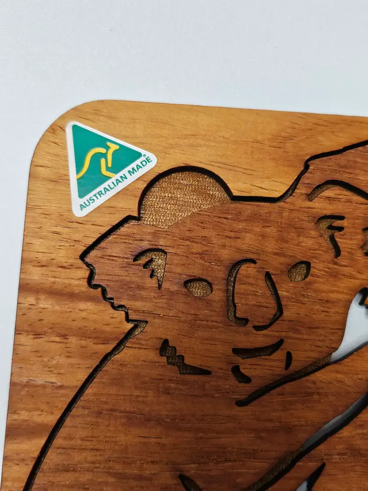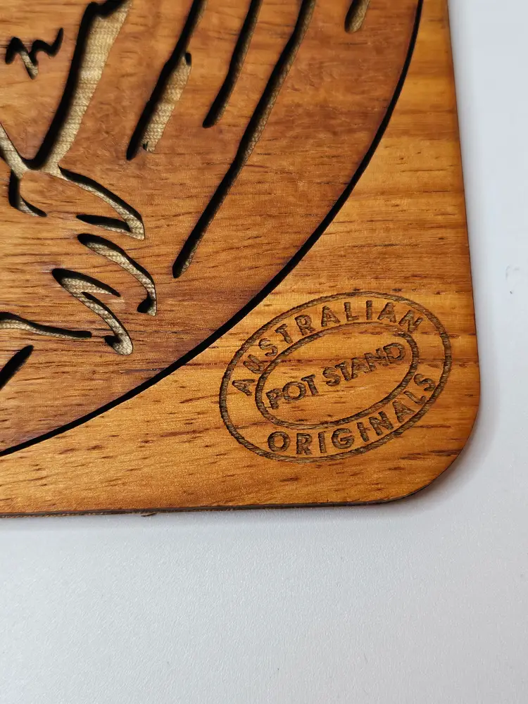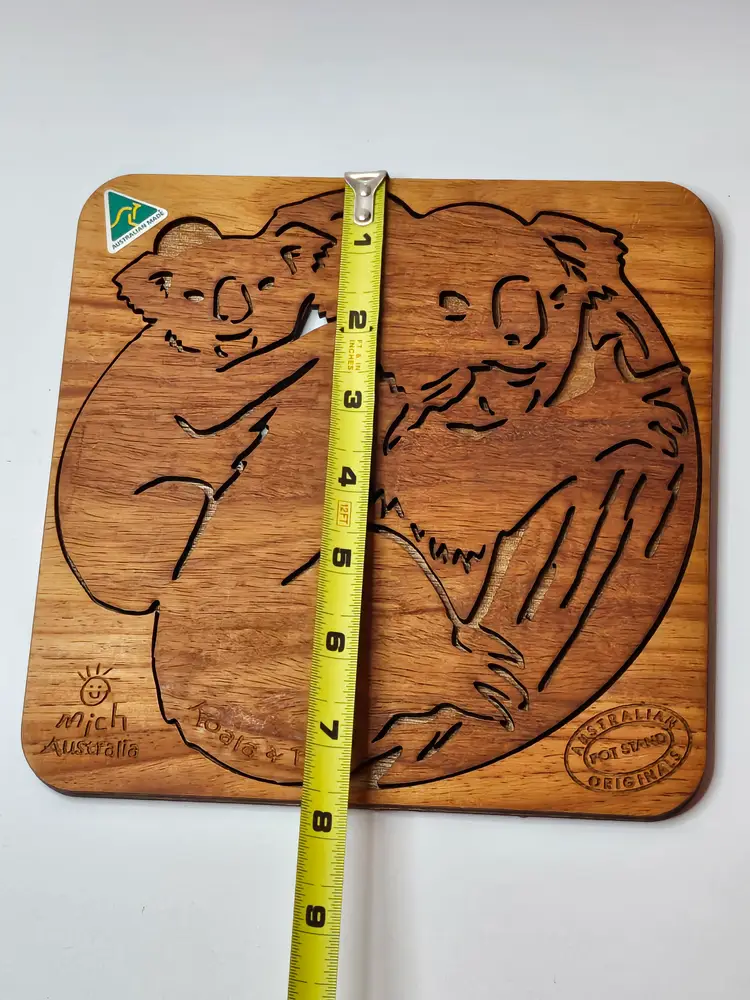The product is a Mich Australian Originals Pot Stand featuring a laser-engraved image of a koala mom and baby. This collectible item showcases the iconic Australian animal, the koala, in a detailed and intricate design. The pot stand serves both a functional and decorative purpose, making it a unique addition to any home or kitchen.