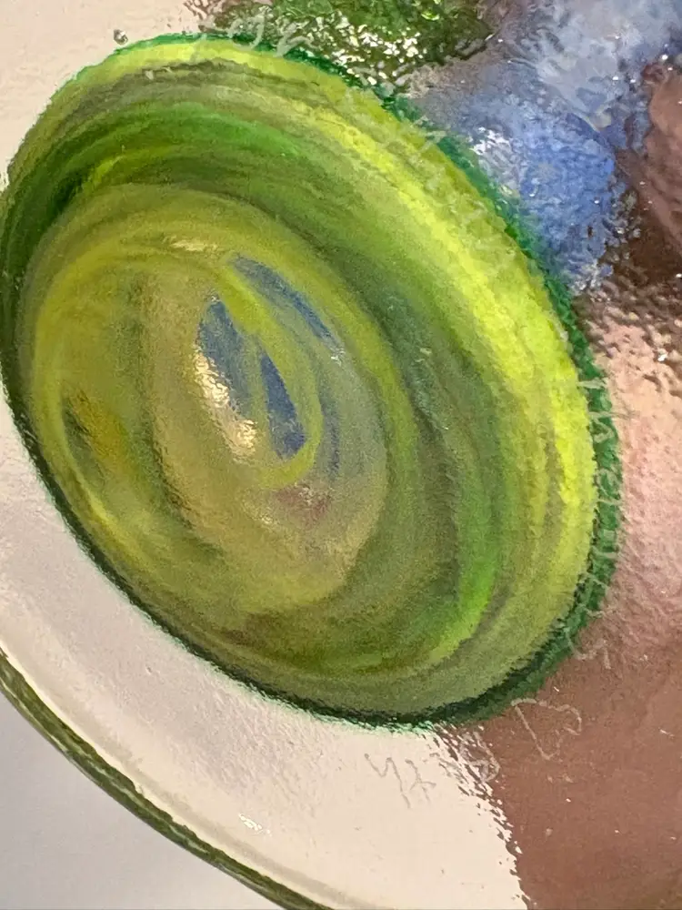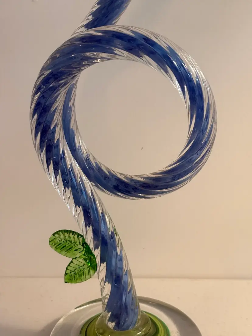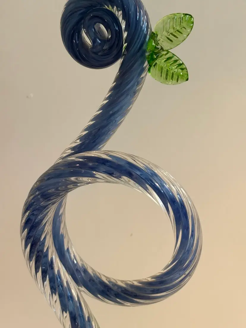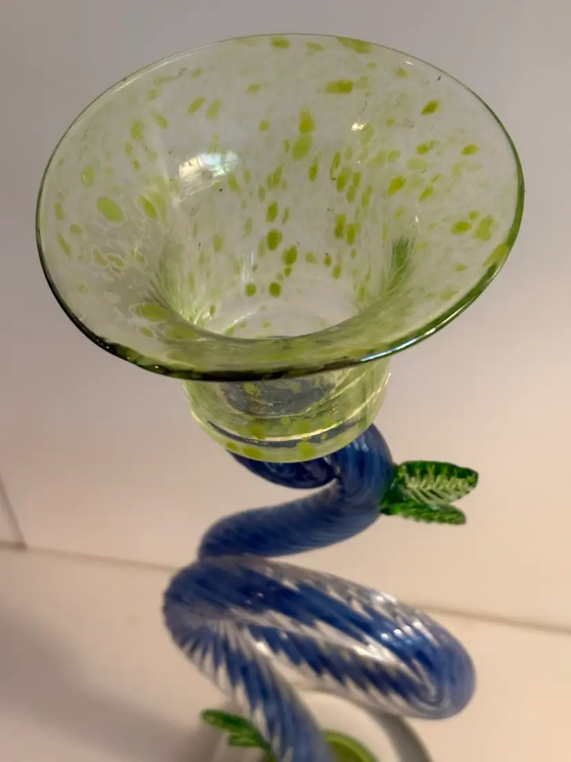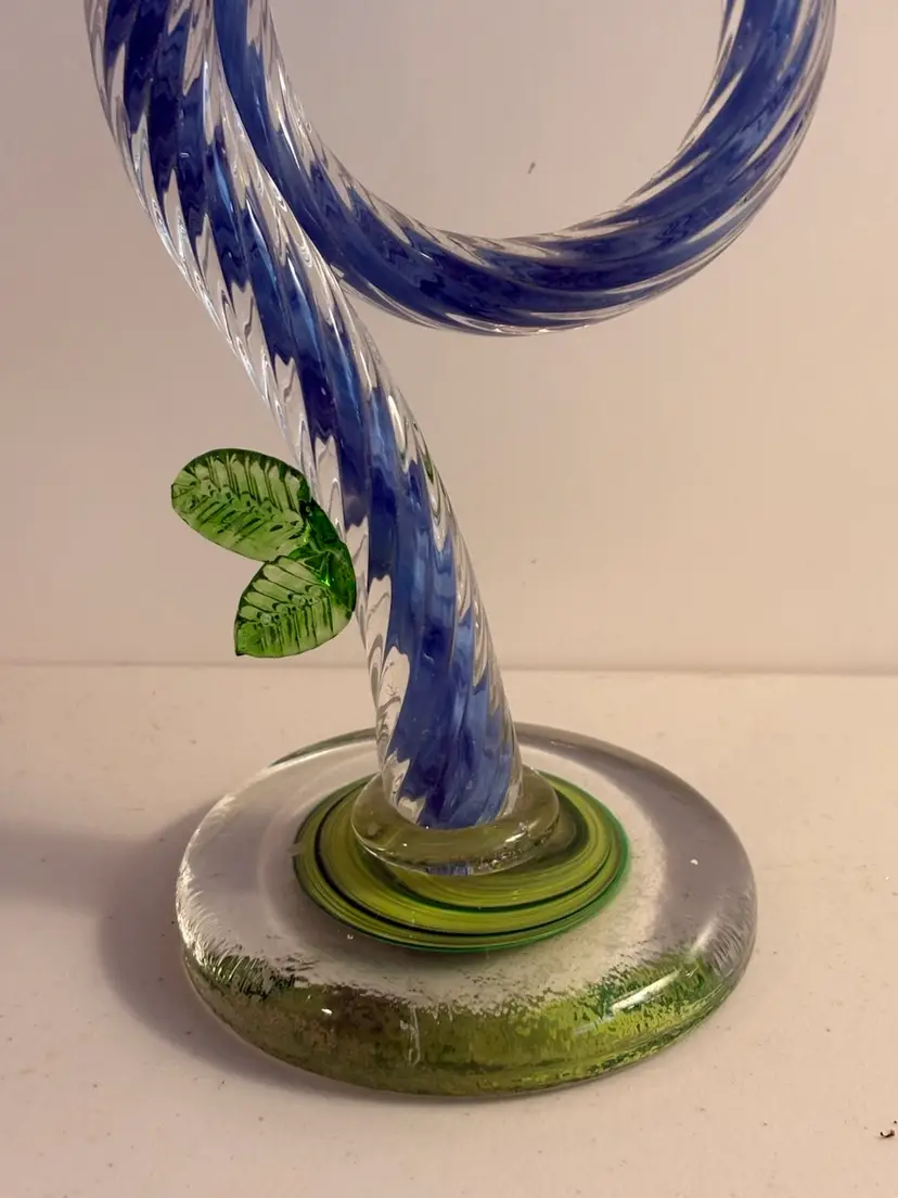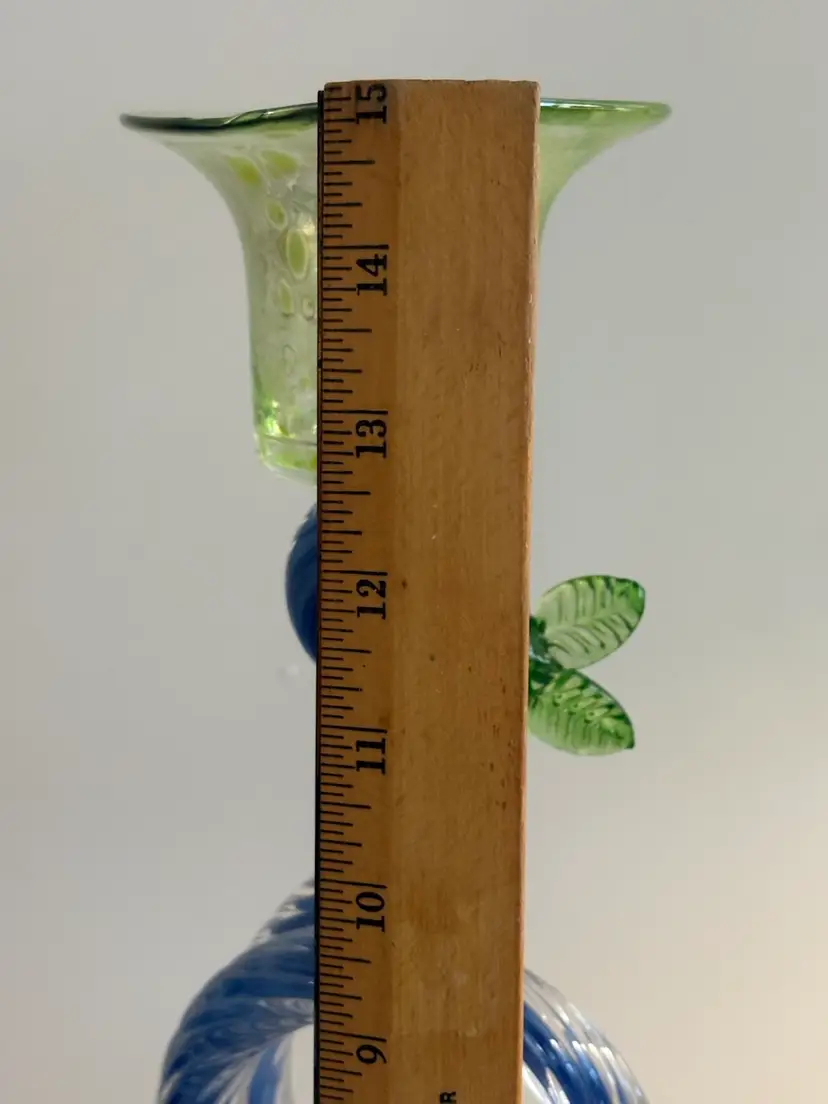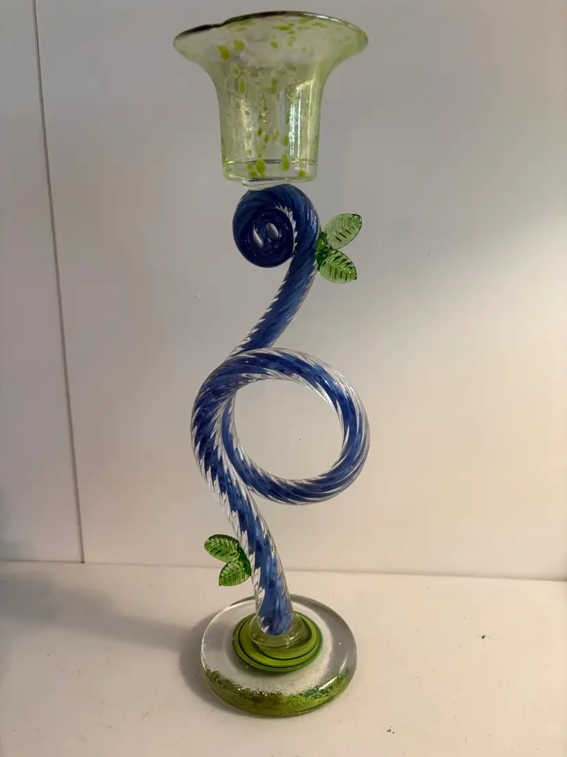 Michael Hudson hand-blown art glass candlestick featuring a twisted blue stem with green leaf details.