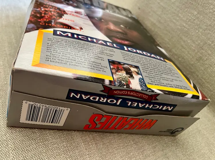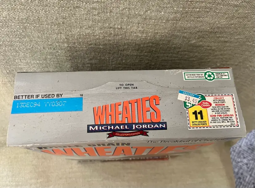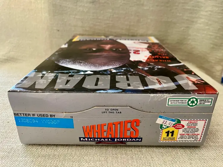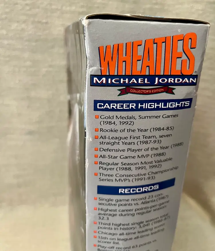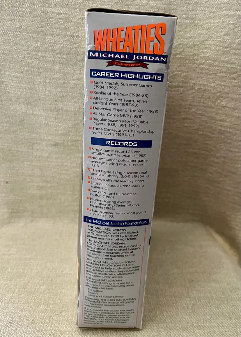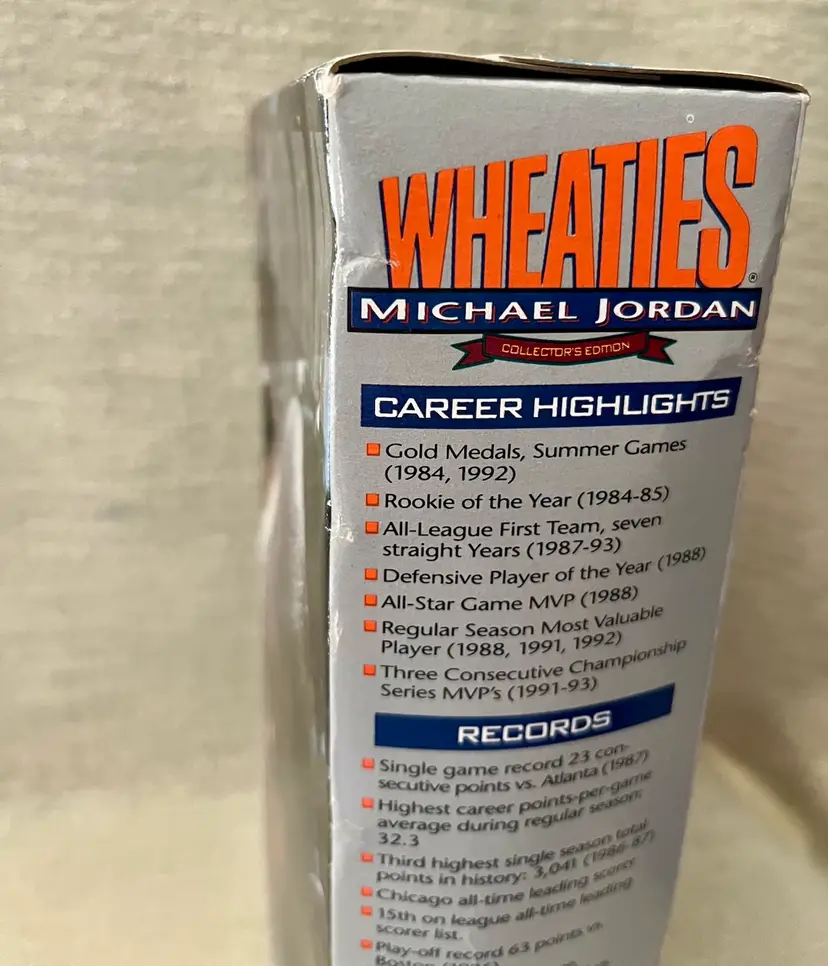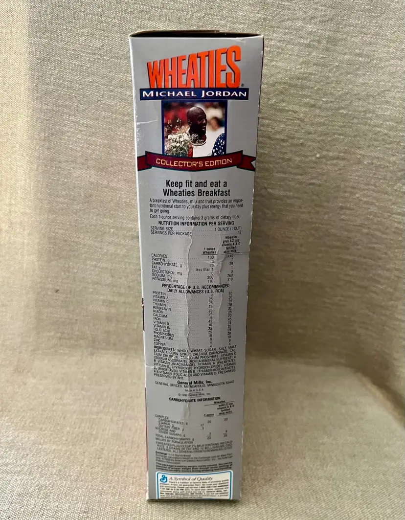 This is a vintage UNOPENED collectors edition Michael Jordan The Breakfast of Champions whole grain flakes Wheaties Silver Cereal Box from 1993. This commemorative item celebrates the legendary basketball player's association with the Chicago Bulls. The original 18oz box is from the United States, making it a prized piece of sports memorabilia for fans of Michael Jordan and basketball enthusiasts alike. The collectible is a must-have for any fan of the Chicago Bulls or Michael Jordan looking to add a unique piece of historical sports memorabilia to a collection. Additionally, an authentic era PROP for theater and other media productions.
