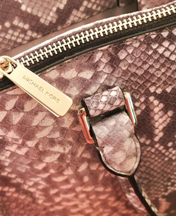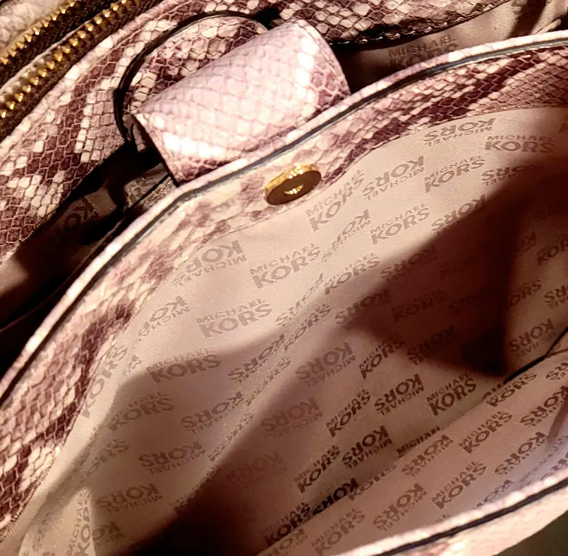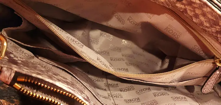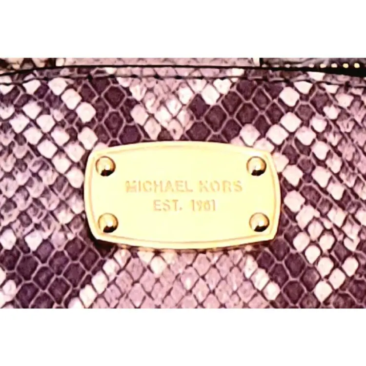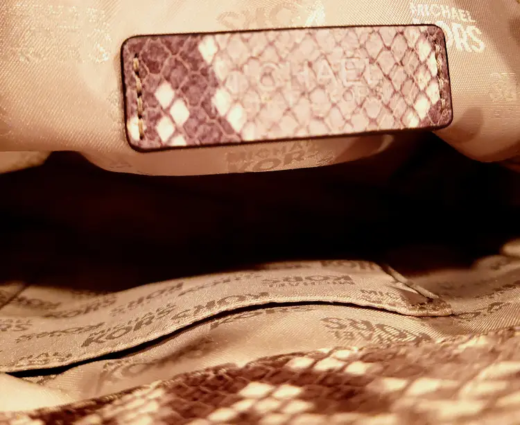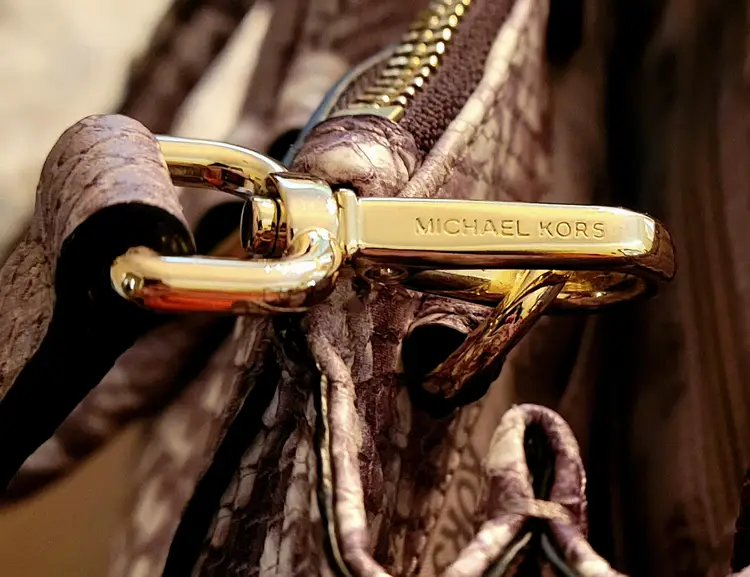 Gold tone Michael Kors name plate on the front of the bag and stamped (Michael Kors)