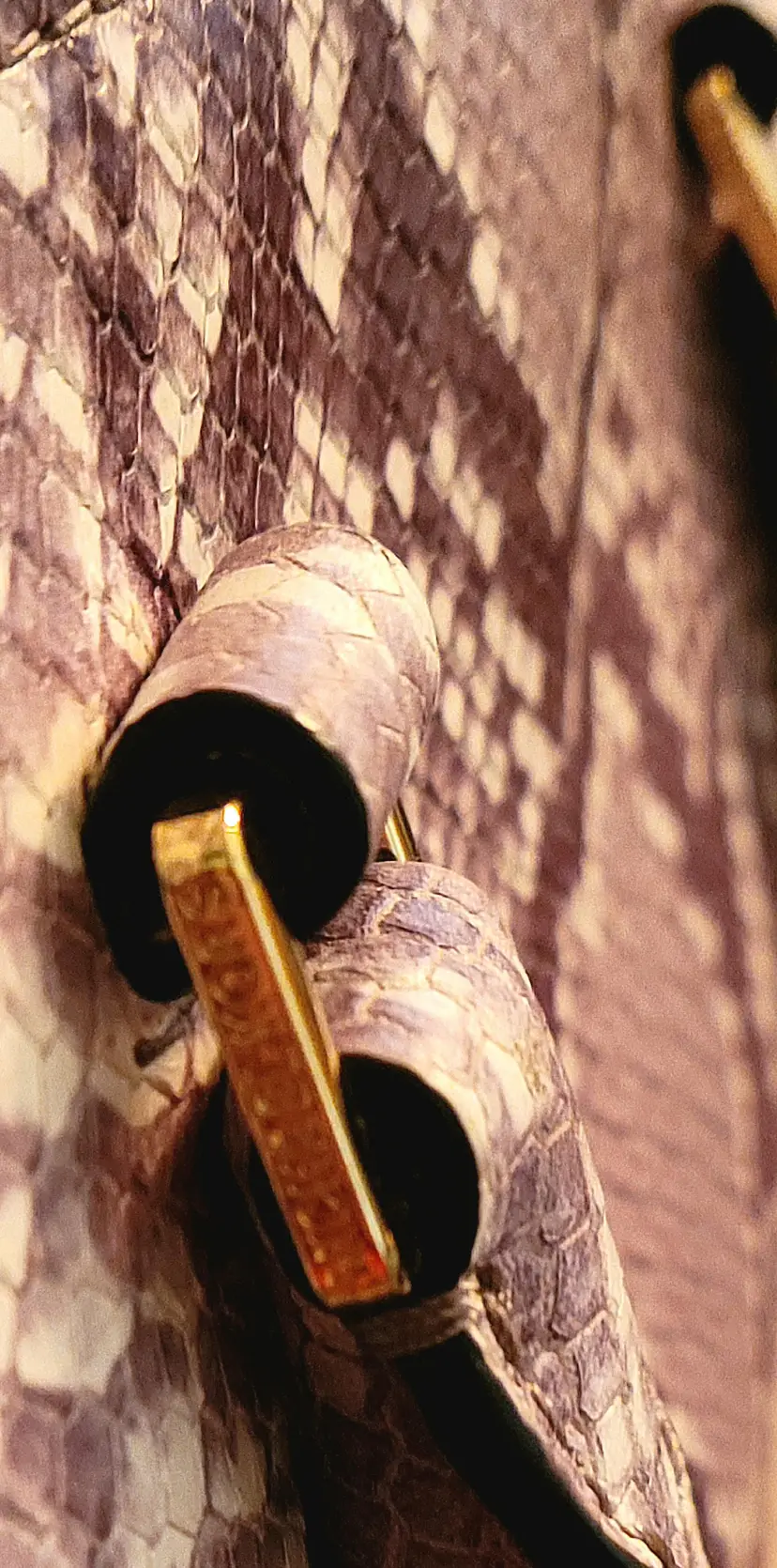 This beautiful bag features a leather embossed python snakeskin pattern, in dark sand, and comes with a detachable shoulder strap in the same embossed leather pattern.