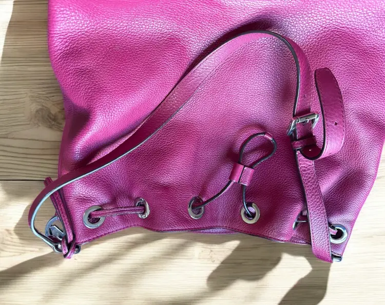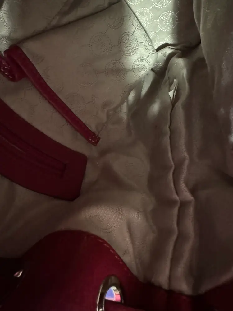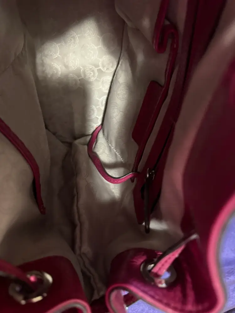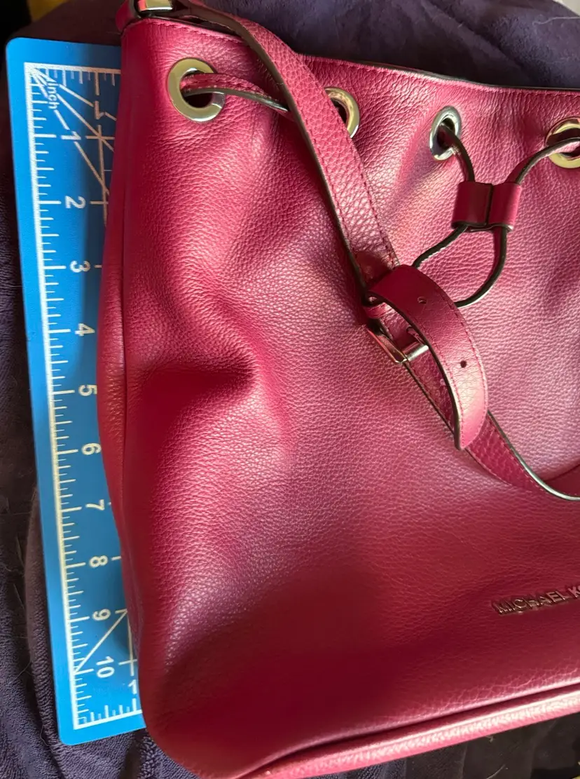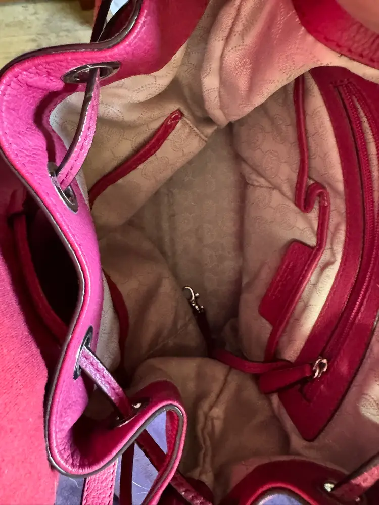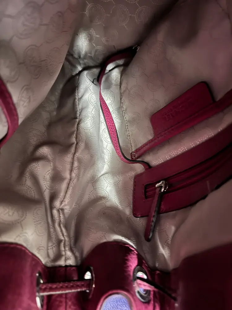 Burgundy drawstring hobo shoulder bag — can still smell the leather. In VGUC -color may vary in photos but it’s the lighting. Color is burgundy with no apparent stains or spots. Clean inside may have tiny spots I missed