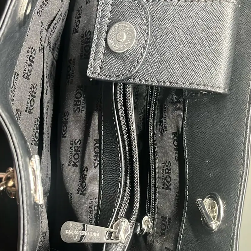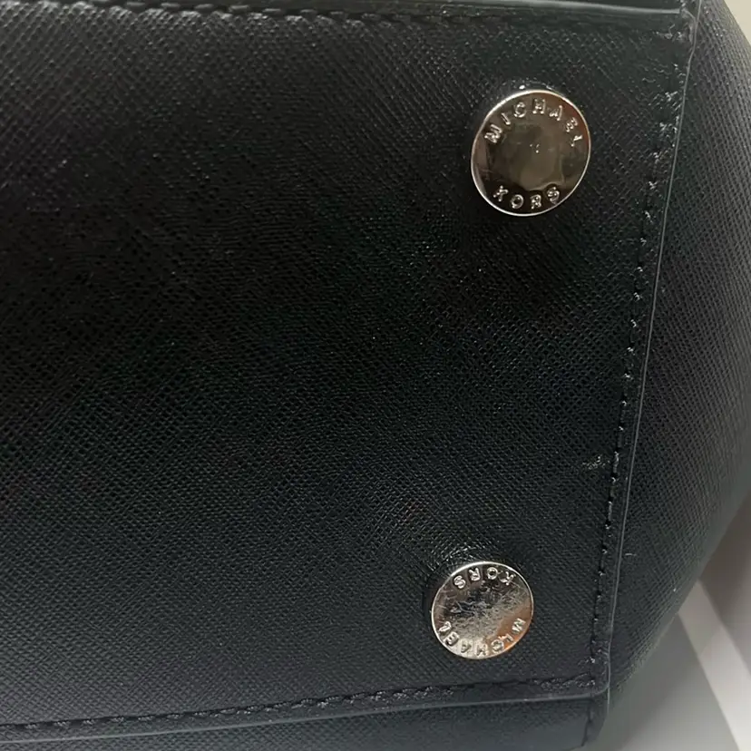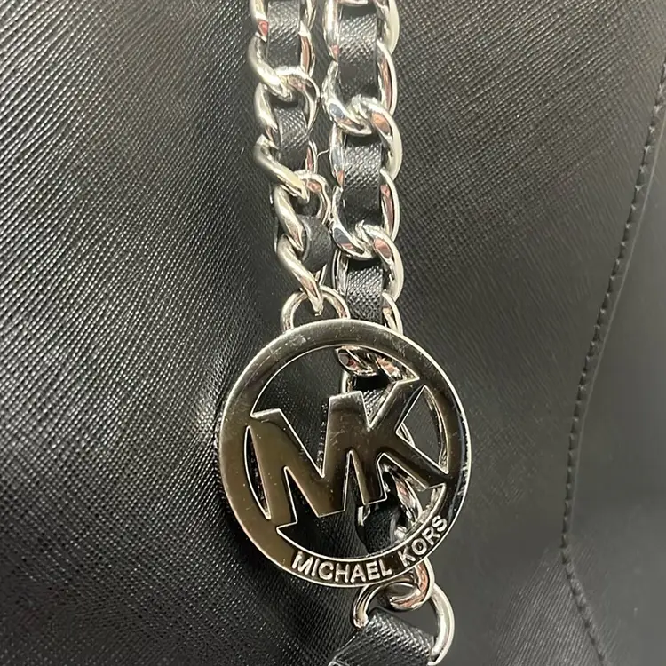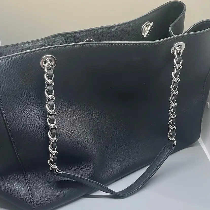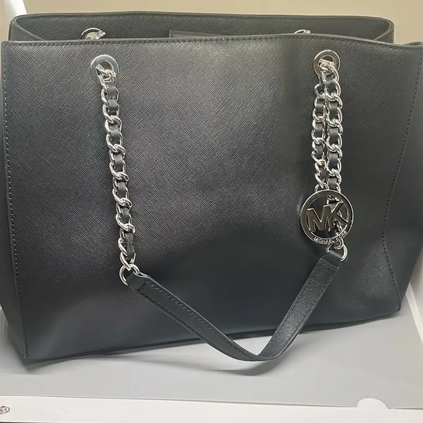 RETAIL: $358 Excellent condition. No marks, tears or scuffs. Gold hardware perfect. This Michael Kors tote bag showcases a sleek black design with luxurious gold chain accents, offering a perfect blend of style and functionality. Its structured silhouette and minimalist aesthetic make it an ideal choice for both professional and casual settings. Crafted with attention to detail, this bag embodies the timeless elegance synonymous with the Michael Kors brand. Double handles 10.5” Magnetic closure Three components - one zip compartment Zip closure pocket inside Signature lining inside Width 14” Height 10.5” Depth 5.5”