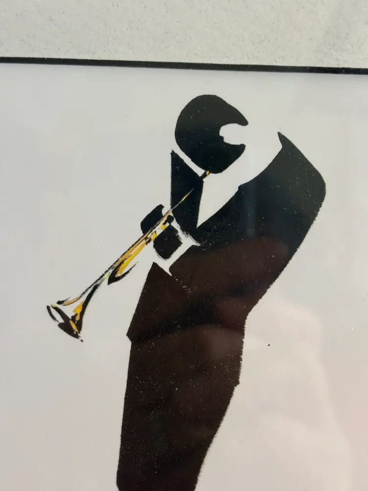 The product is a Michel Canetti jazz musician silhouette print that is matted and framed. This artwork features silhouettes as its subject, showcasing unique and intricate designs that capture the essence of jazz music and musicians. The matted frame adds a sophisticated touch to the print, making it a perfect addition to any art collection or music lover's space.