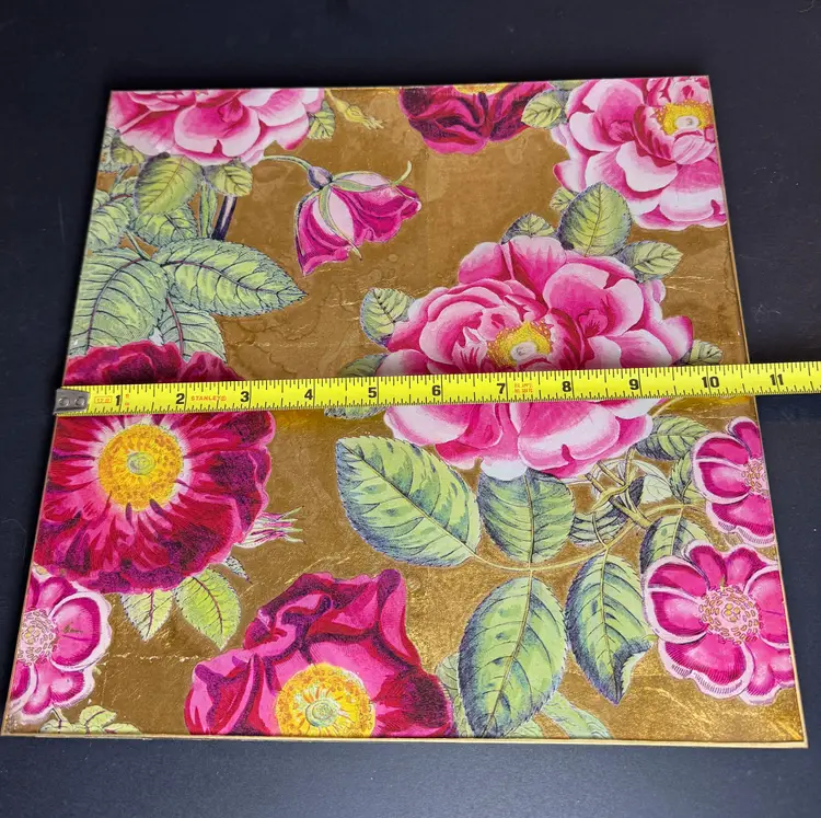 This gorgeous floral and gold decoupaged glass plate is slightly concave in the center, making is a bit like a bowl. Can be used for serving or as decor. There is a mar on the backside, but is not visible from the front. Please see all photos.