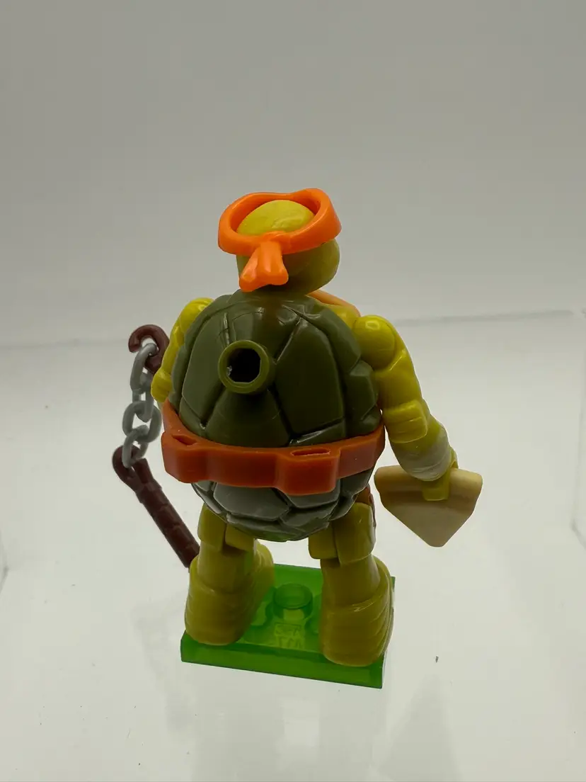 Michelangelo Teenage Mutant Ninja Turtles Minifigure Includes minifigure, nunchuks, pizza slice & stand block From Mega Bloks Teenage Mutant Ninja Turtles Series 1 blind packs Figure stands about 2 inches tall Removed from pack to assemble and list