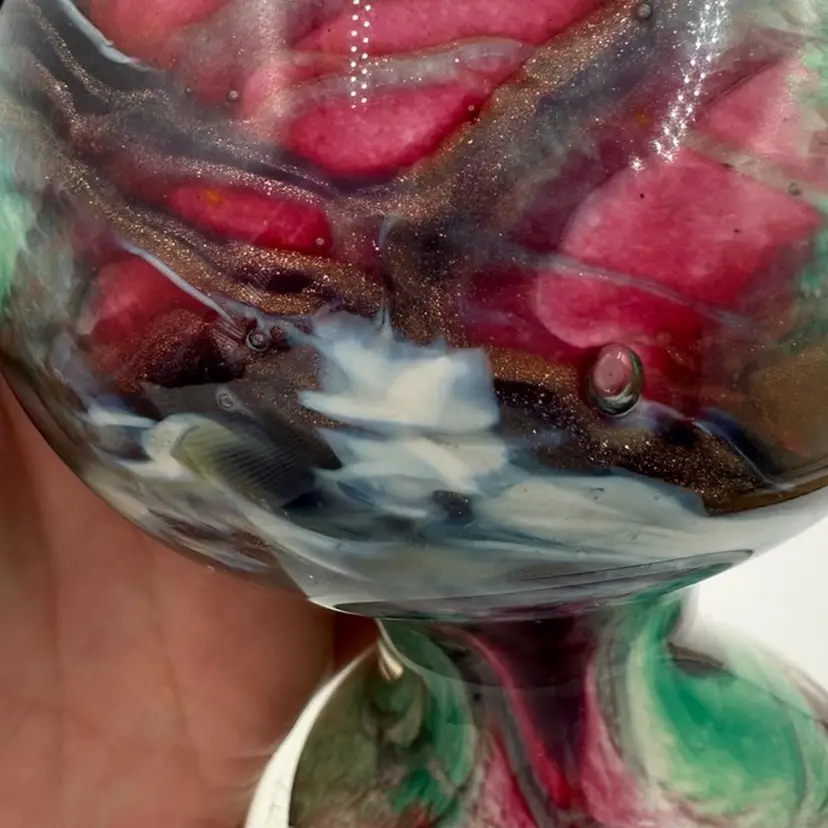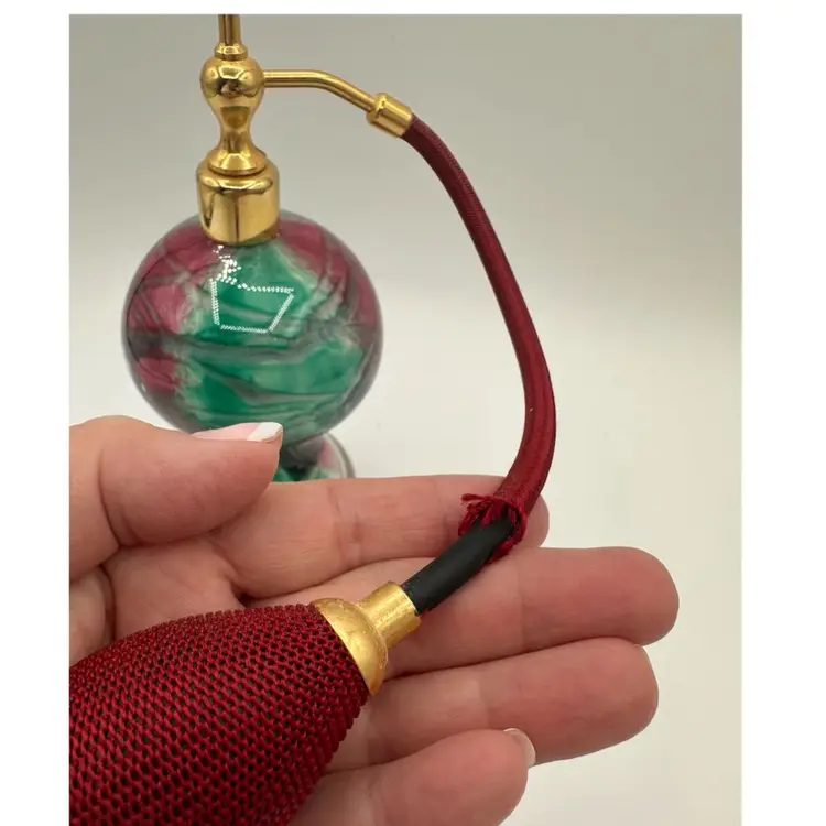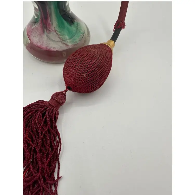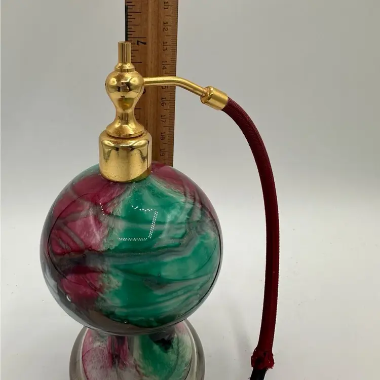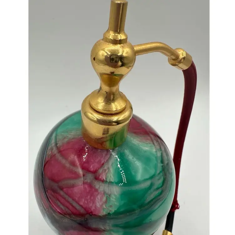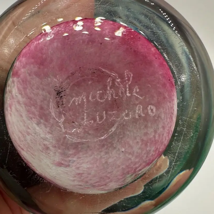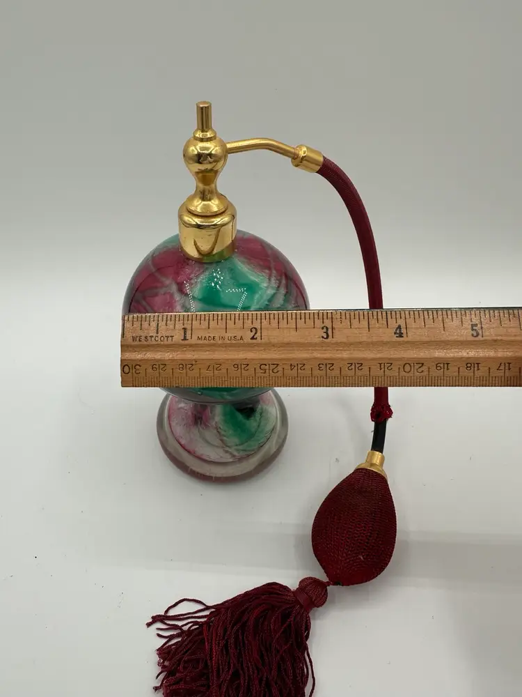 Vintage and made by love signed by Michele Luzoro. Michele was born in 1949 and married to another glass blower from France Jean-Claude Novaro sharing the same creative imagination and worked in Biot, France. The glass is in excellent condition, no chips or cracks. There are a few scattered bubbles . The atomizer works but some of the material is tattered, as shown in the picture. It’s my opinion that it was made in the late 1980’s- early 1990’s because of the colors used . The flecks of gold that run throughout this piece show off its shear elegance.