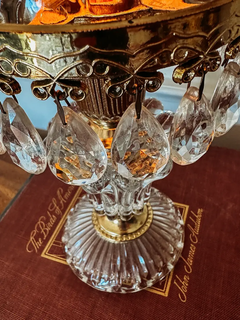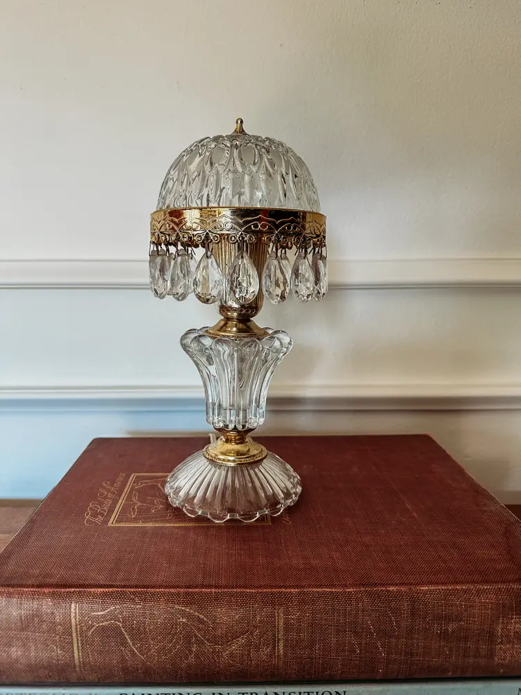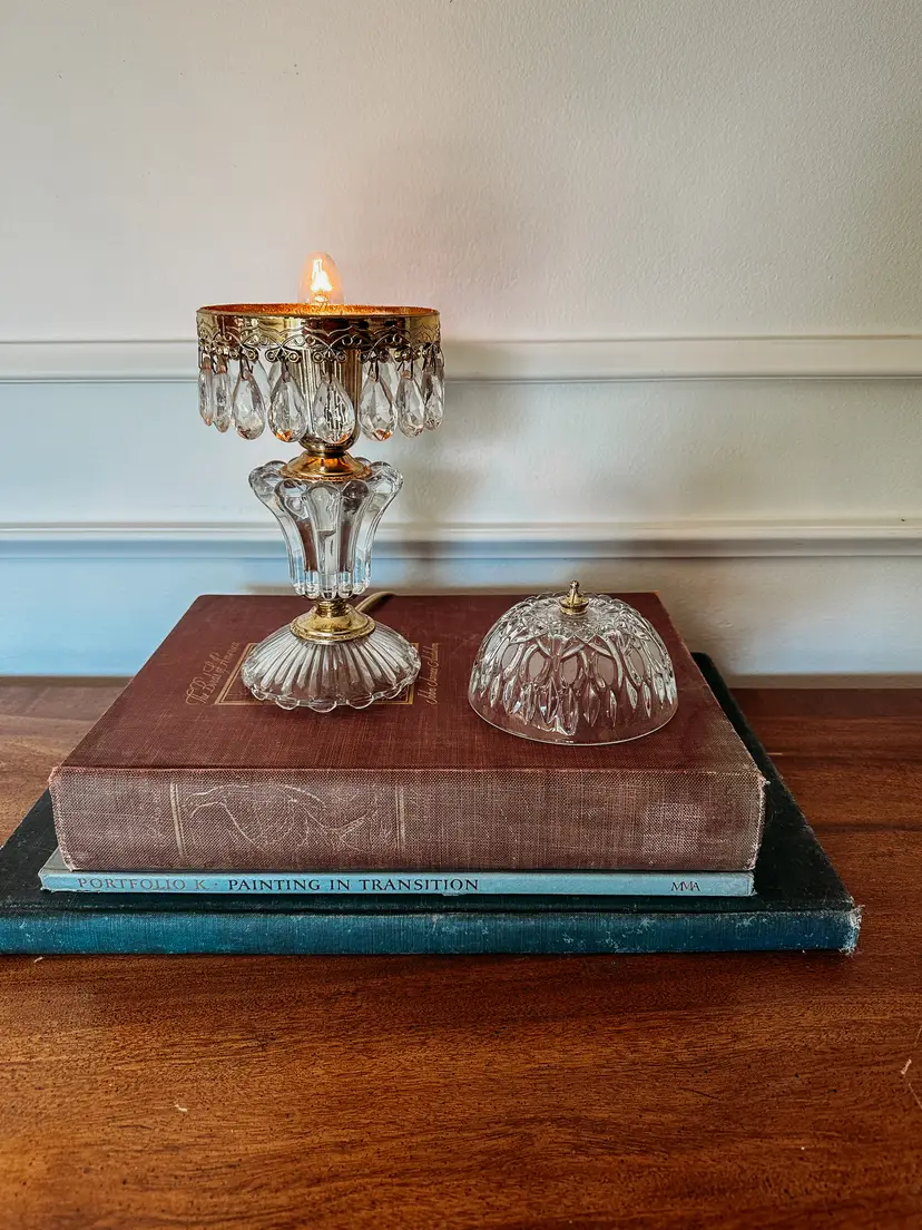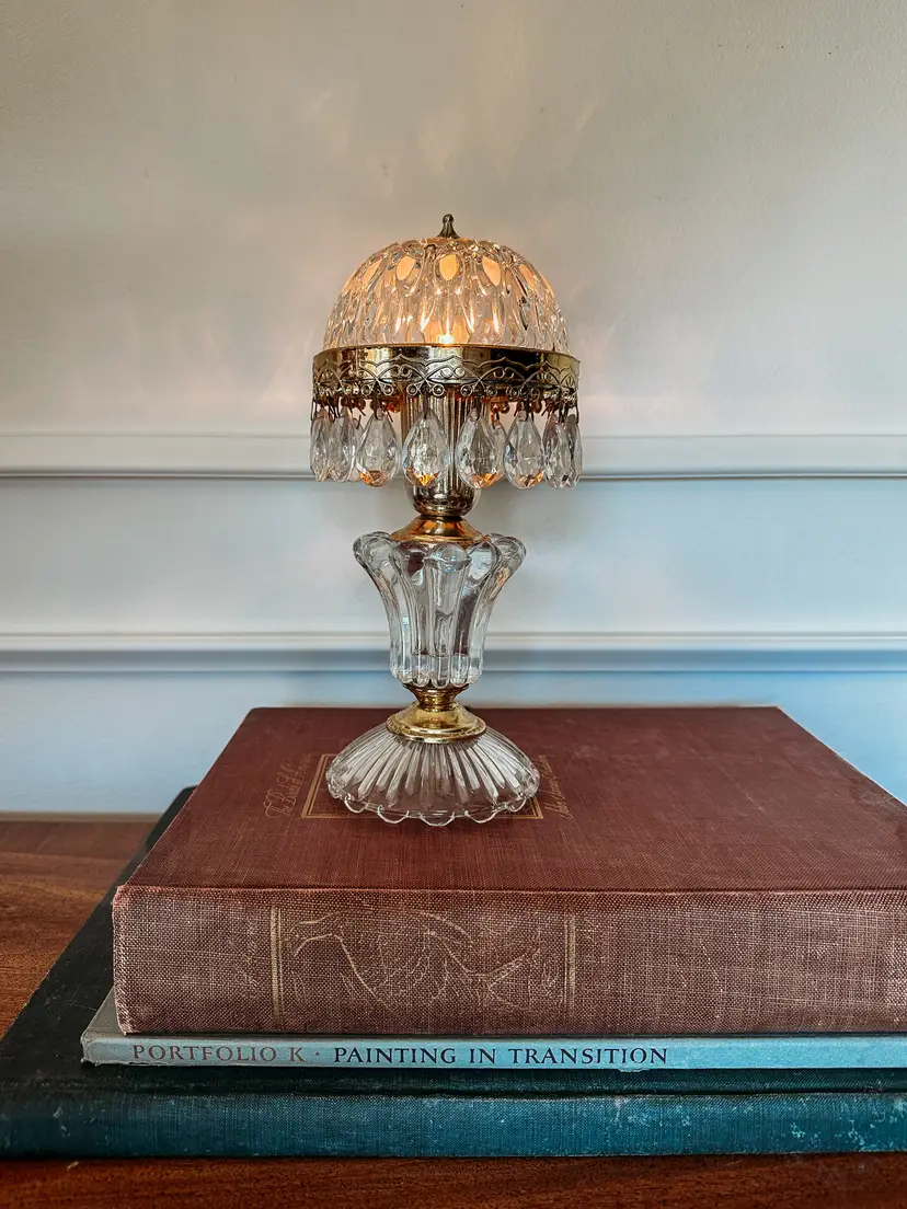 Charming small accent lamp by Michelotti. Has all hanging prisms. No chips or cracks. Top glass piece lifts off to easily replace bulb.