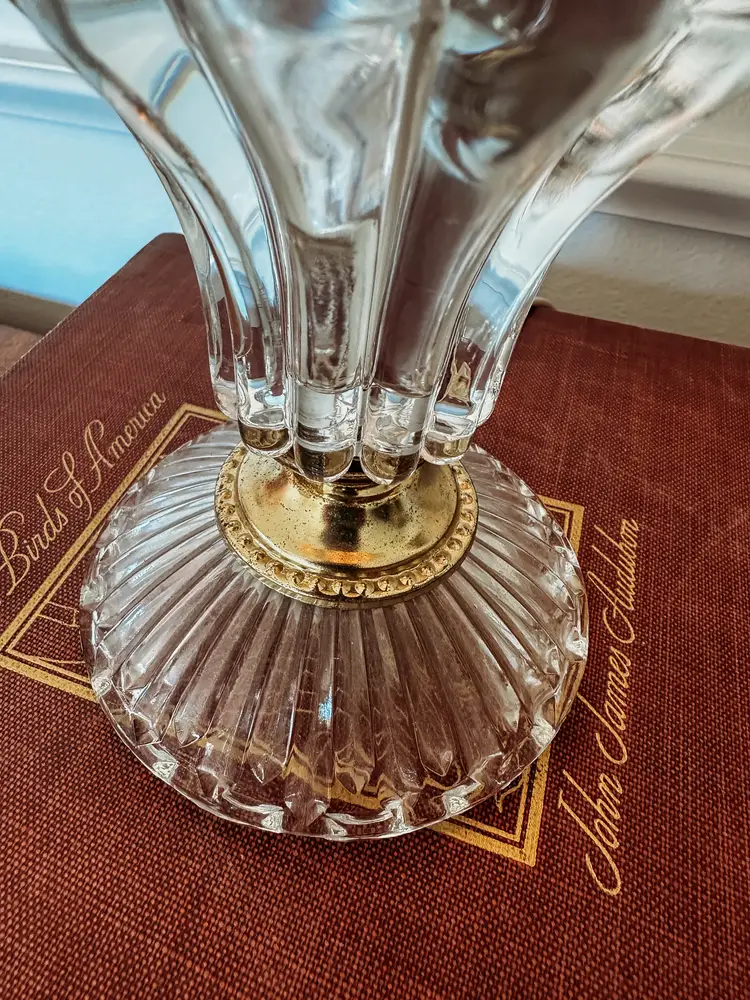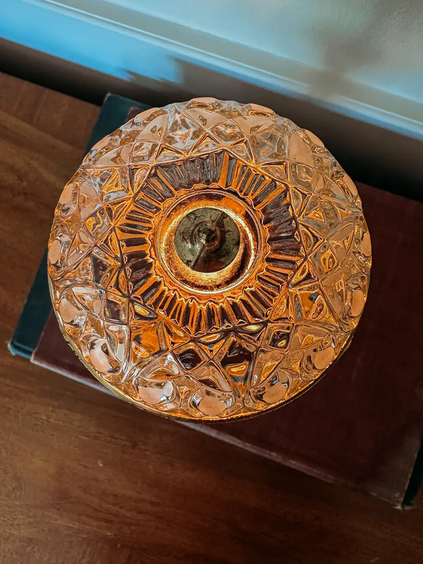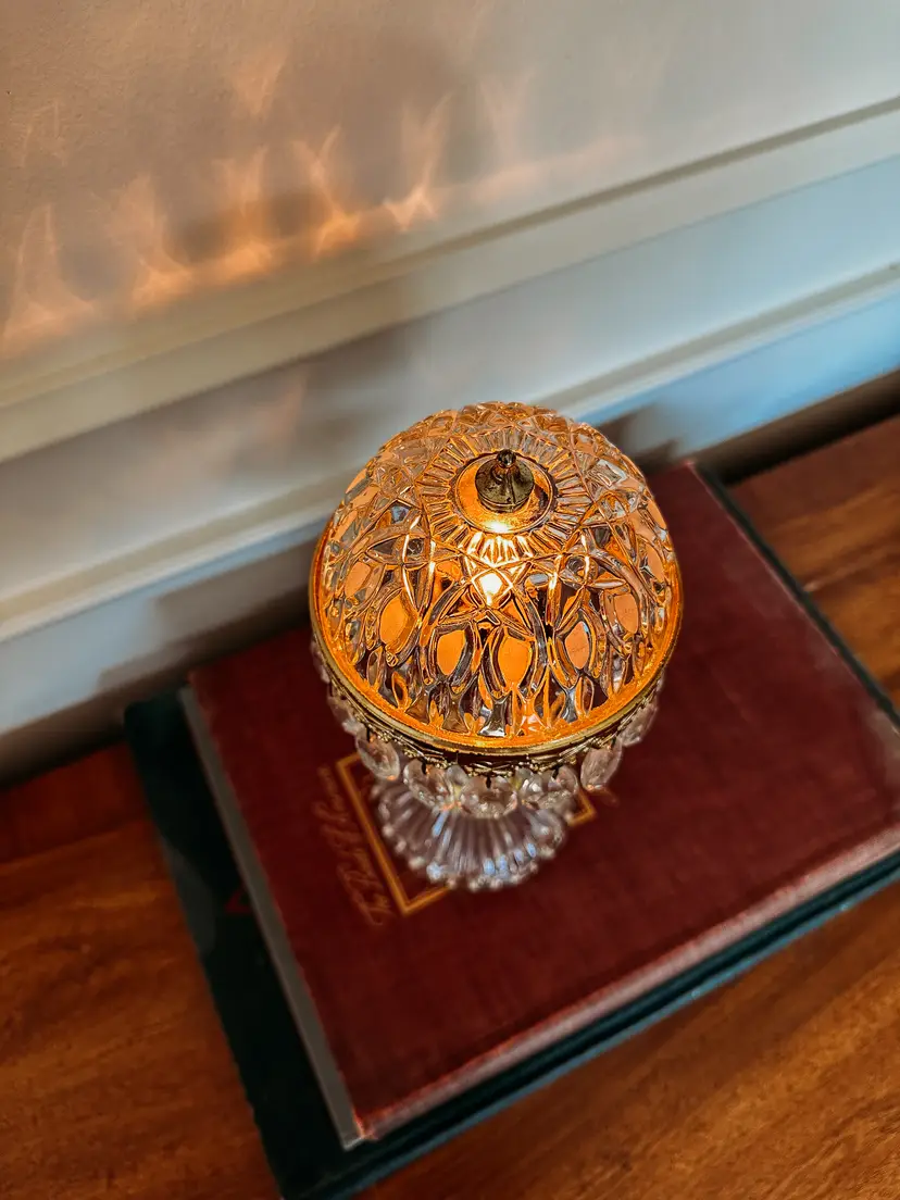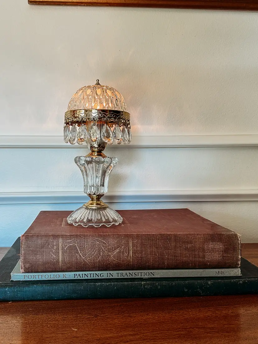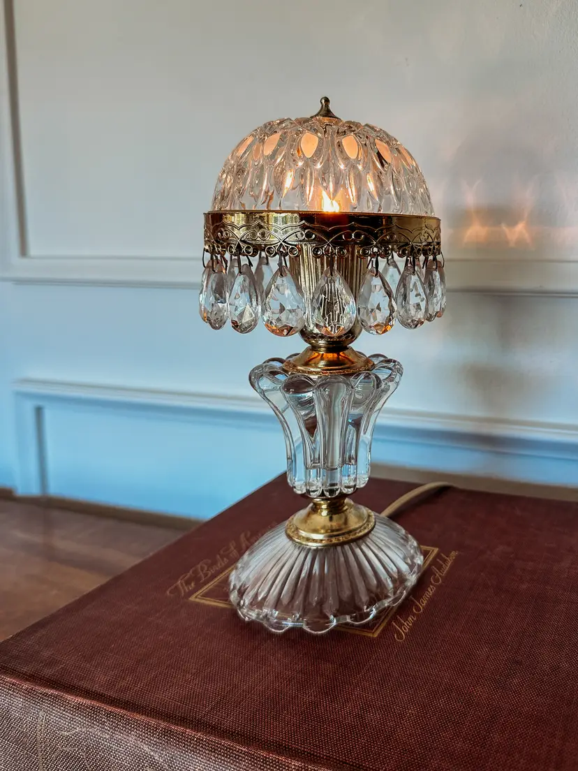 Charming small accent lamp by Michelotti. Has all hanging prisms. No chips or cracks. Top glass piece lifts off to easily replace bulb.