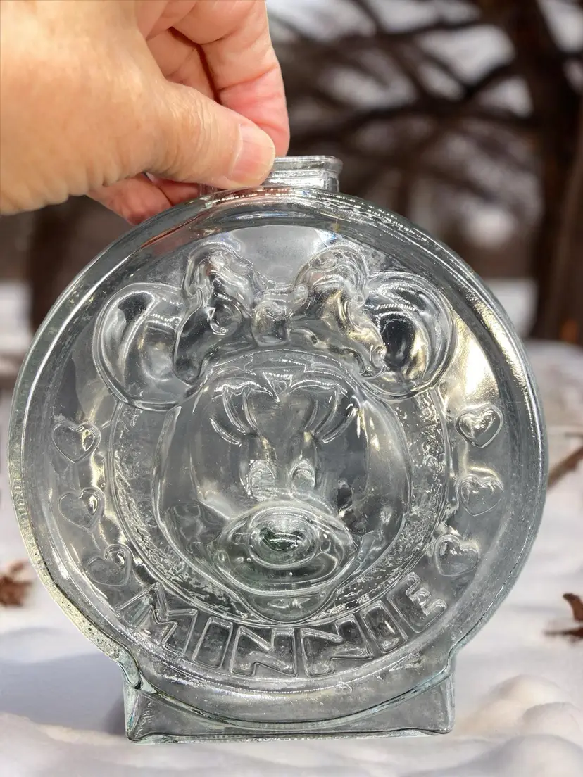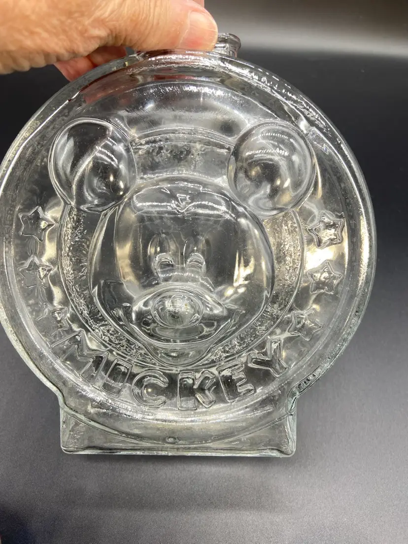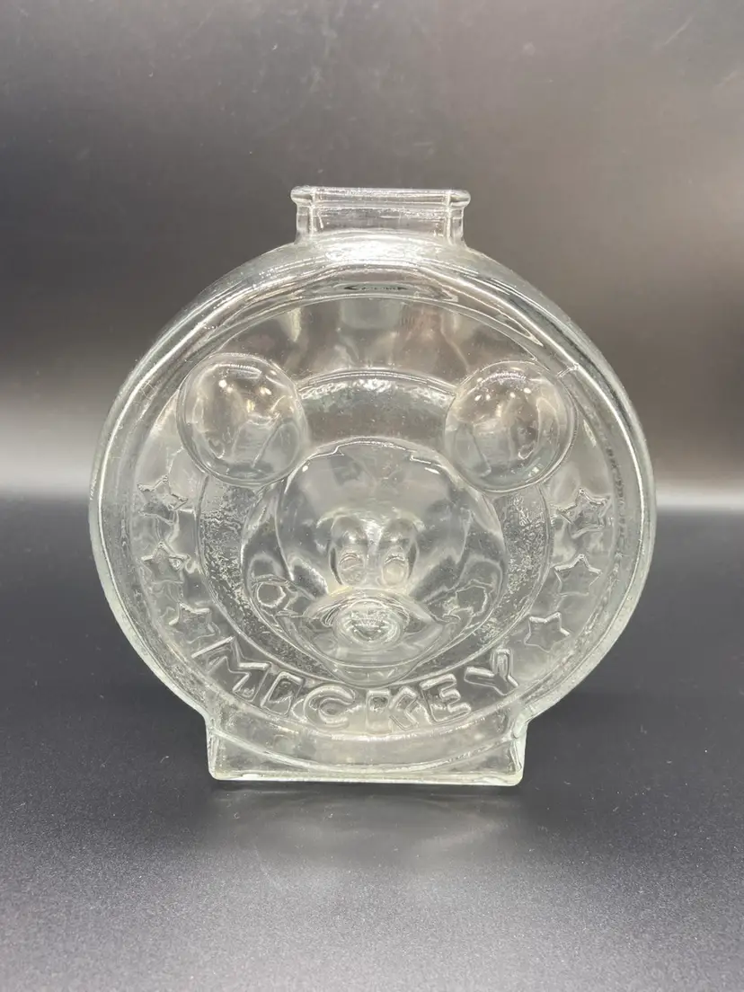 Heavy glass vintage, Walt Disney company, Mickey Minnie piggy bank 7 inches tall 6 inches wide Mickey on one side Minnie on the other