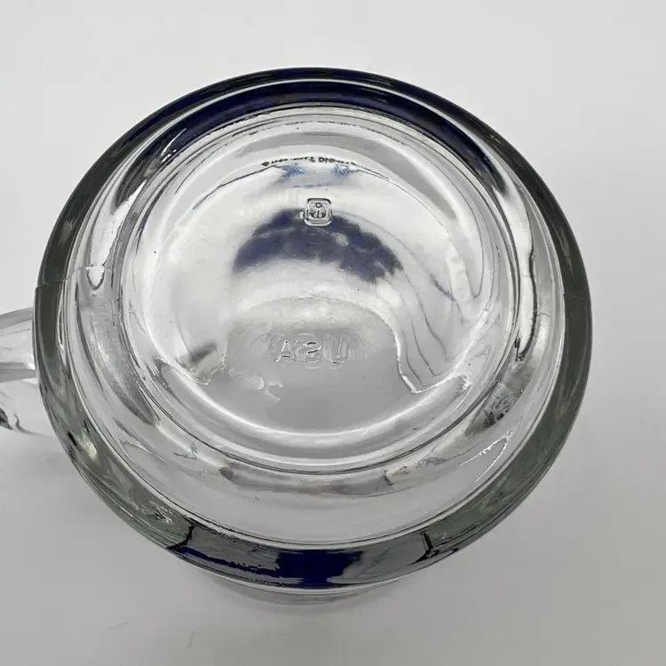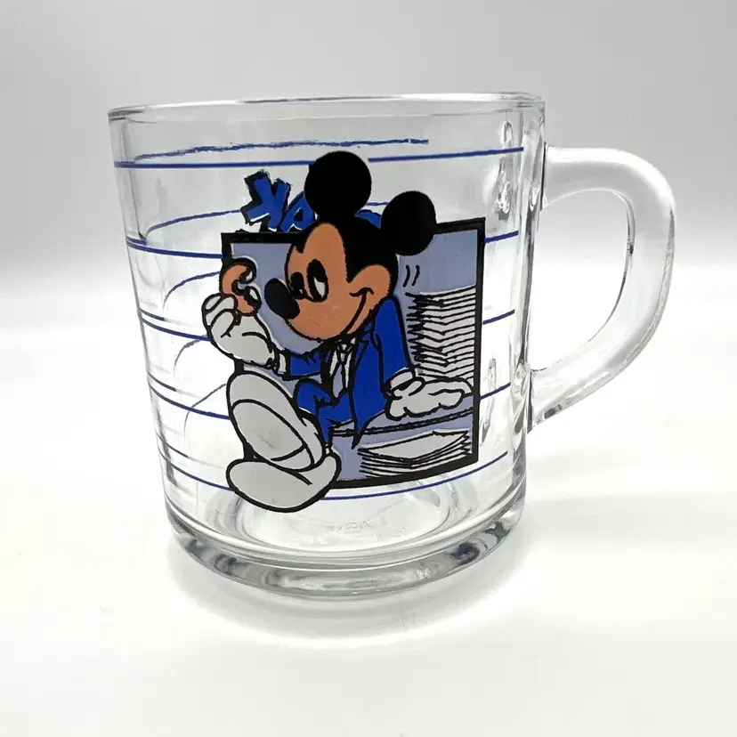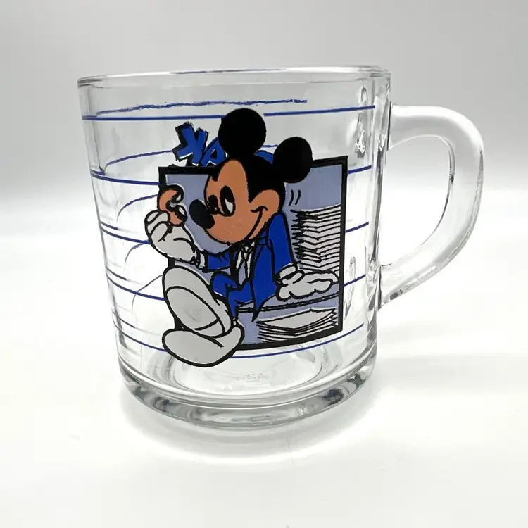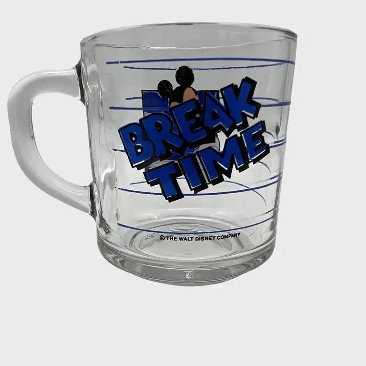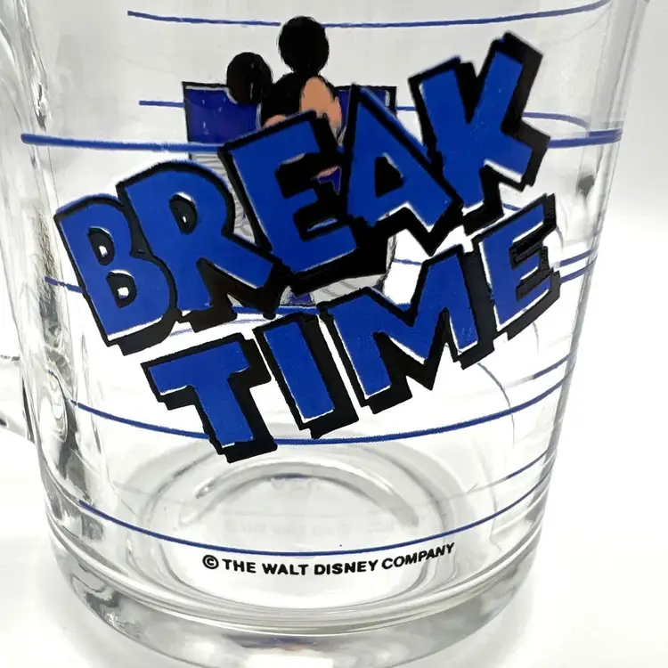 Vintage Mickey Mouse Break Time glass mug. It is approximately 3 1/4" tall and made by Anchor Hocking.