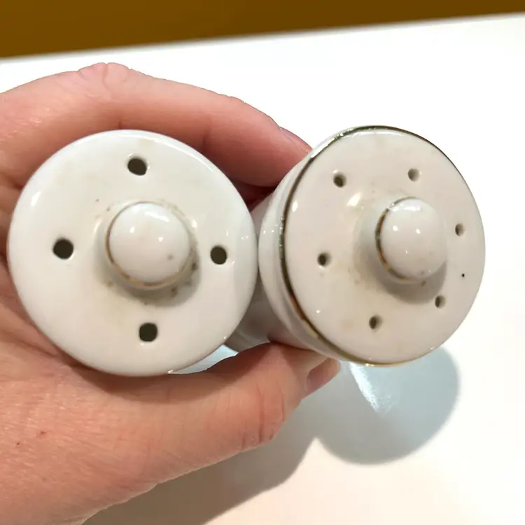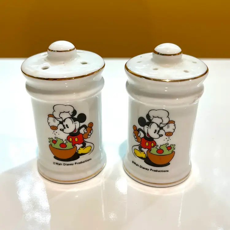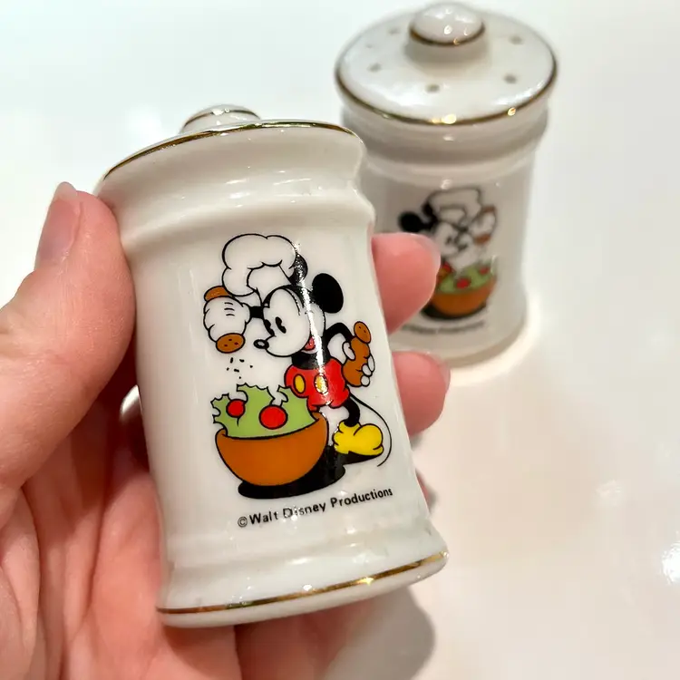 Vintage made in Japan Mickey Mouse Disney salt and pepper shakers. These are in excellent condition with no chips or cracks and original foil “Japan” sticker on bottom.