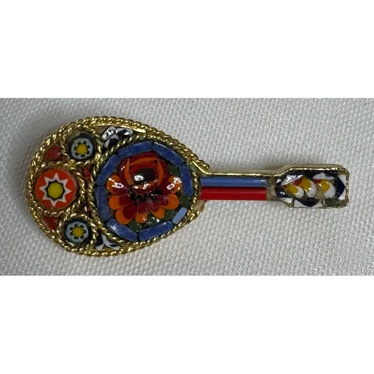 Beautiful pin using techniques of the old masters of Italy. The main flower and neck of the mandolin are micro mosaic. The three small flowers at the bottom are bits of glass canes that would be used in millefiori paperweights and the like.