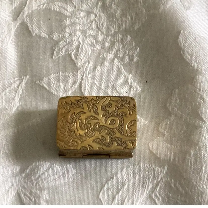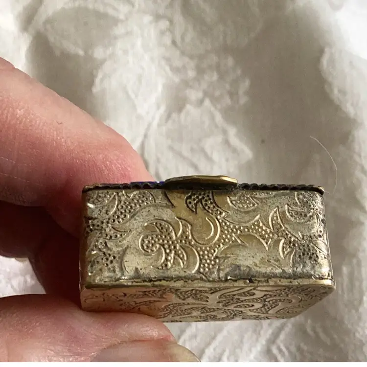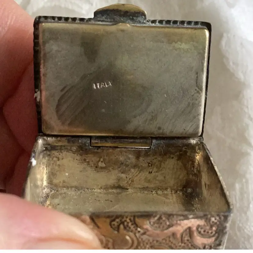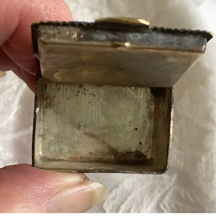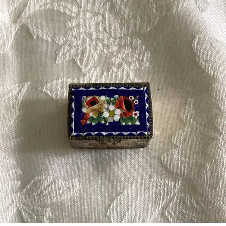 Antique Micro mosaic trinket box signed inside. 1 1/4 “ x 1 “ heavy for it size. Unknown metal