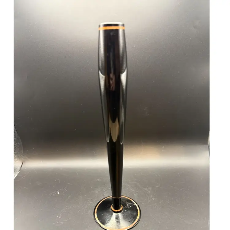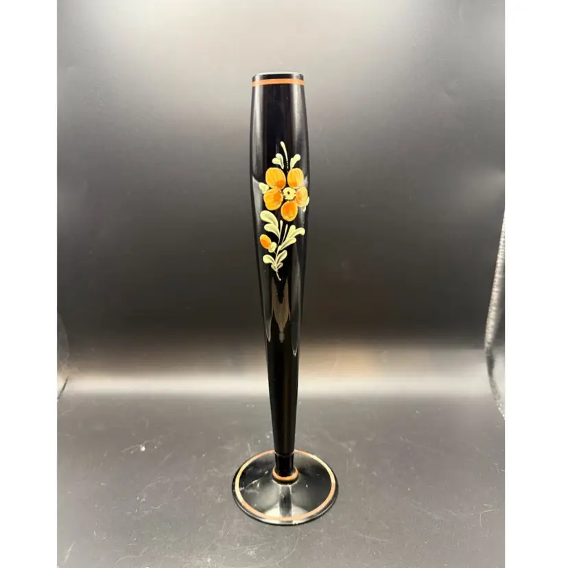 This particular vase, with its sleek black glass and hand-painted floral design, exemplifies the aesthetic sensibilities of the mid-20th century. The combination of a dark, glossy finish with delicate, colorful ornamentation was a common feature in decorative arts of the era, aiming to add a touch of elegance and artistic flair to domestic spaces. Such vases were often used as standalone decorative objects or to display single blooms, contributing to the overall ambiance of a room.