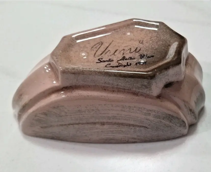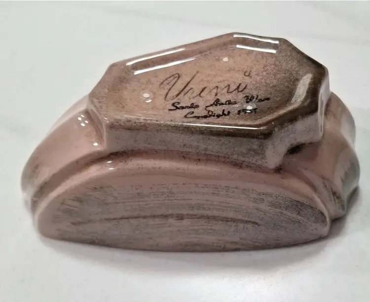 The vintage Mid Century 1951 Santa Anita Ware Vreni ceramic pink duck covered dish signed by the brand. This unique piece features a duck-shaped covered bowl with a glossy finish, made of pink ceramic with brown accents. With its mid-century modern style and production technique of pottery, this item is a charming addition to any collection or display. Measuring 6.5 inches in length and 5 inches in height, this one-of-a-kind piece is a beautiful representation of the era of 1950s artistry and design.