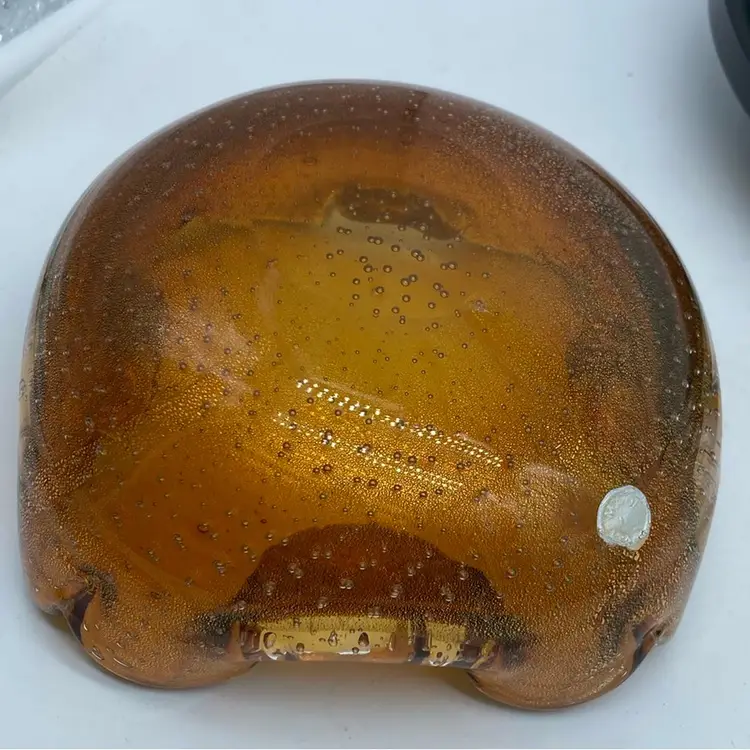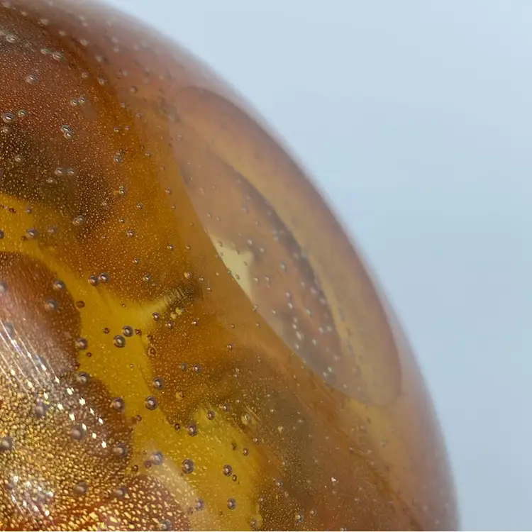Amber-colored glass with gold flecks was also a popular style during the mid-century modern era. These pieces were often produced as decorative items such as vases, bowls, and ashtrays. Given the style and technique, this piece likely originates from Venice, Italy, and was created during the mid-20th century. The bullicante technique combined with the amber color and gold flecks makes it a desirable piece for collectors of mid-century art glass.