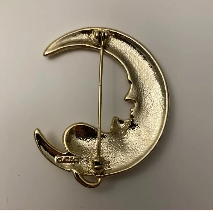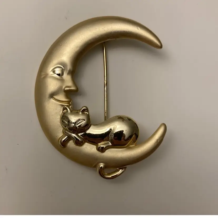 Mid century American Jewelry Chain Co. gold tone cat sitting on the moon brooch pin. Brooch measures 1 1/2” x 1 7/8”. Marked AJC on back.