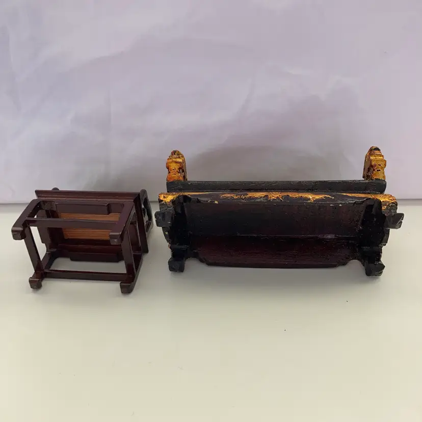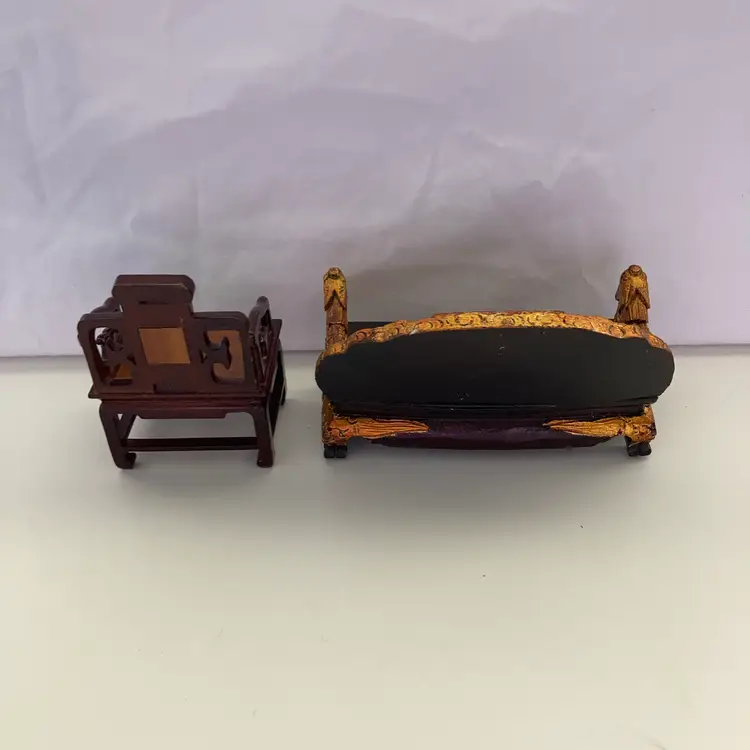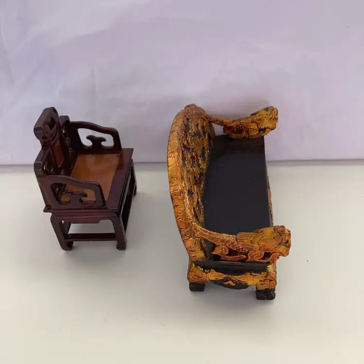 Mid-century handcrafted Asian themed wooden doll furniture. There is a dragon patterned sofa and chair set. The sofa measures 2” x 4 1/2” x 2 3/4” tall. The chair measures 1 1/2” x 2 1/4” x 3”. In goodcondition.
