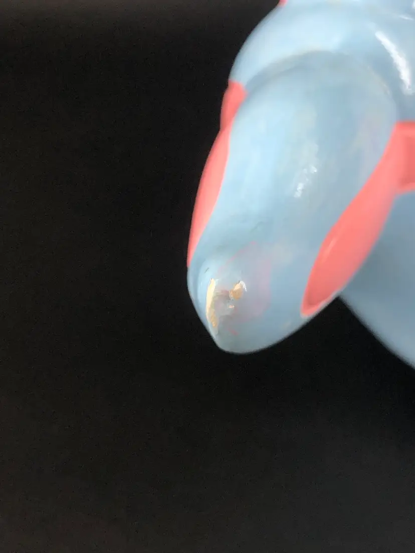 Has a small chip on the tail Really cute Signed on the bottom Does not have a stopper Hand-painted and absolutely the most adorable
