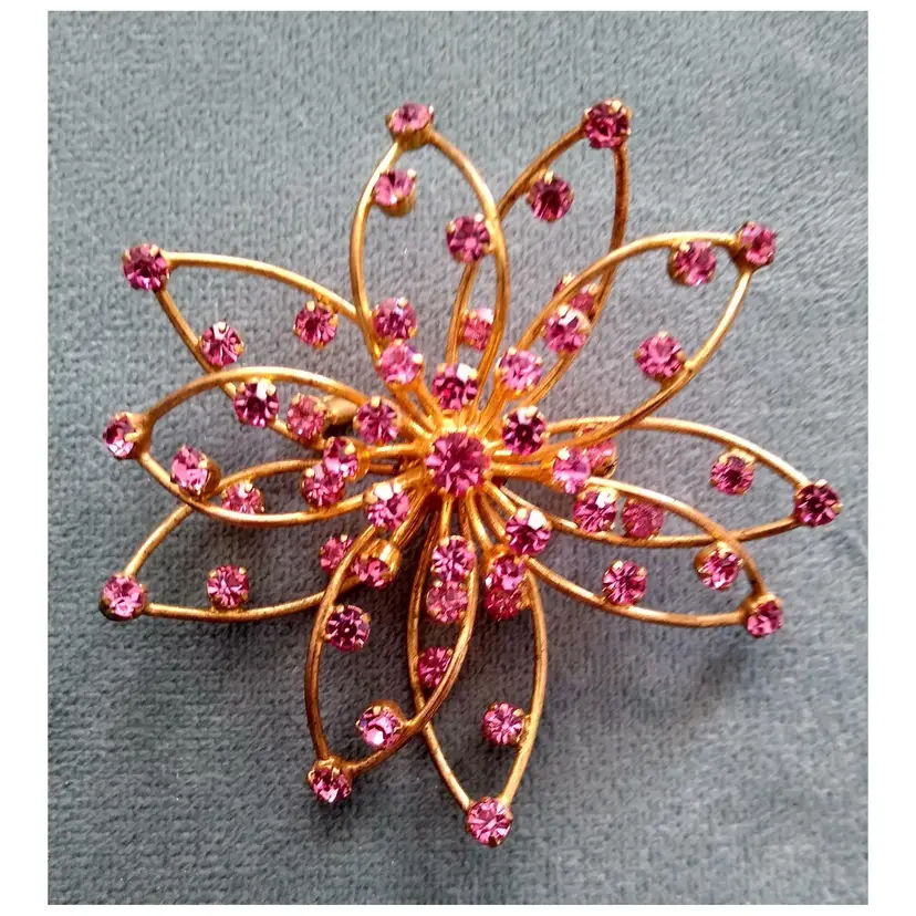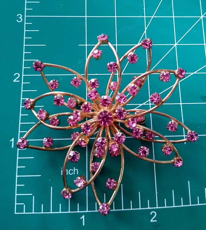 Add a pop of color with this stunning vintage brooch featuring vibrant pink rhinestones arranged in a floral design. Perfect for any outfit!