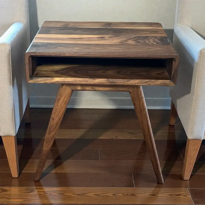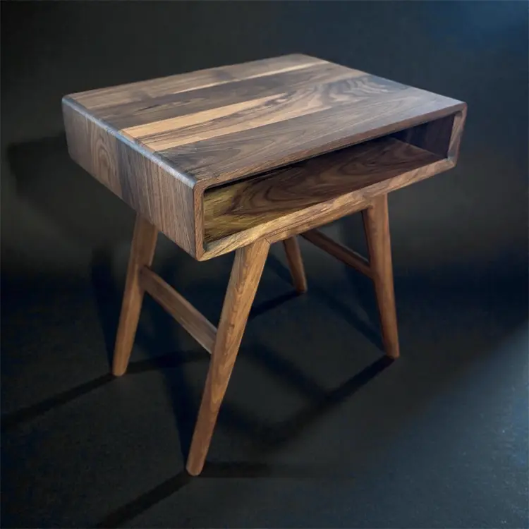 These solid hardwood side tables have a timeless mid century aesthetic, made with all wood joinery that will last a lifetime. The finish is a high end hard wax oil that’s non toxic and durable. They’re 21 inches tall and available in 16x16 inch table tops, and 20x16 inch table tops. Thank you for your support in a small one man woodworking shop, specializing in functional art.