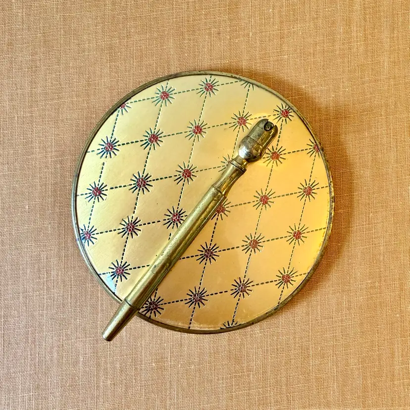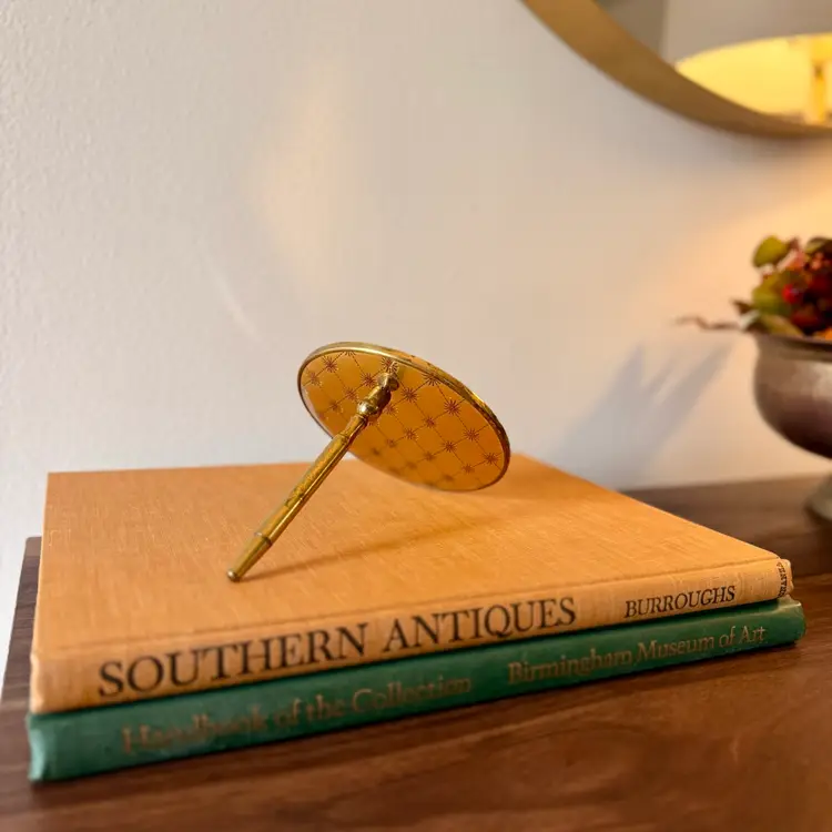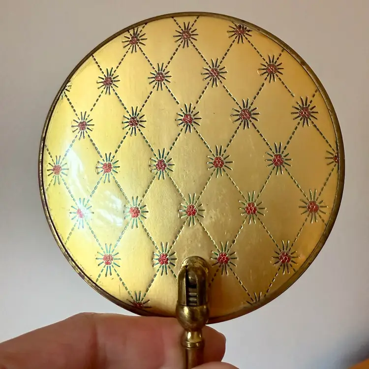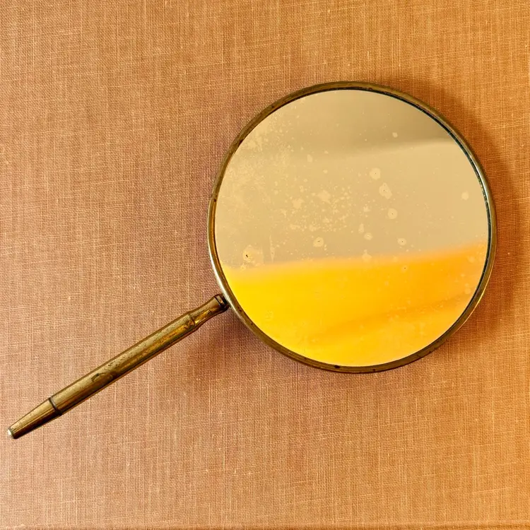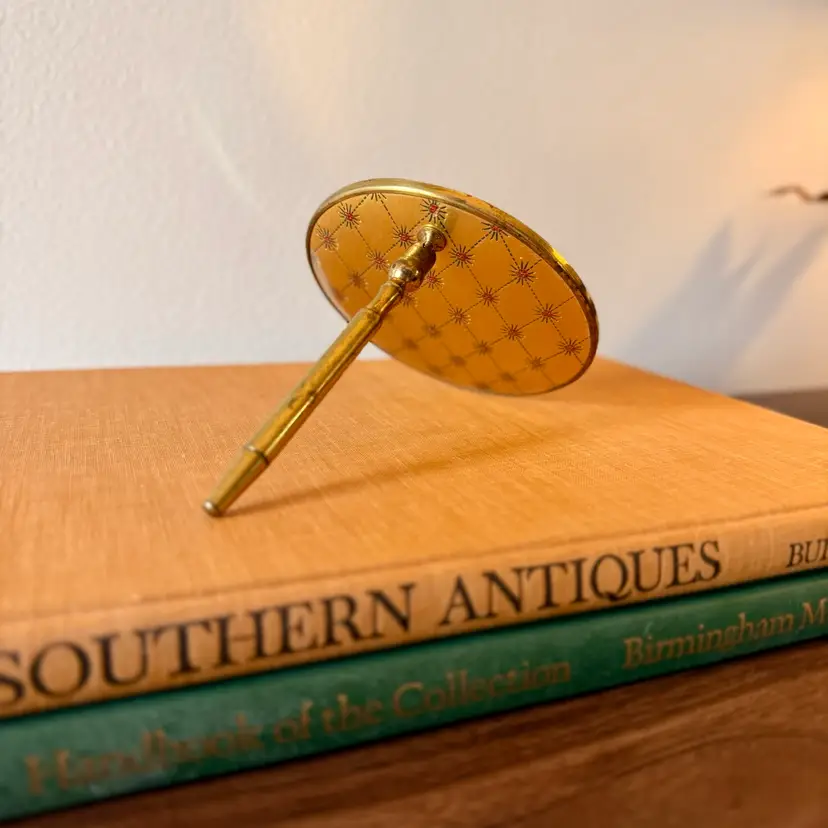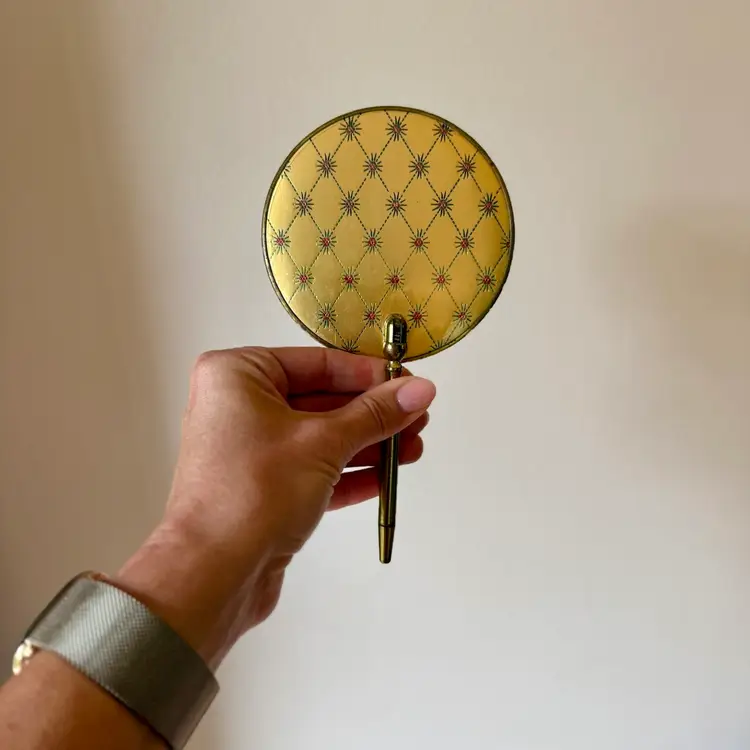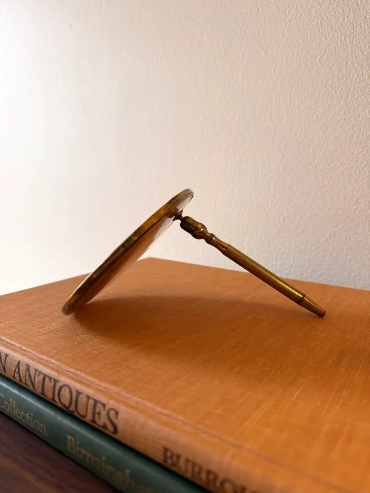 This incredibly unique mid-century magnifying hand mirror is full of charm and thoughtful design. It features a sleek brass handle that not only feels sturdy and substantial in your hand but also folds down for easy storage or display. Even better, the mirror can stand upright, making it perfect as a tabletop mirror when you need hands-free use.