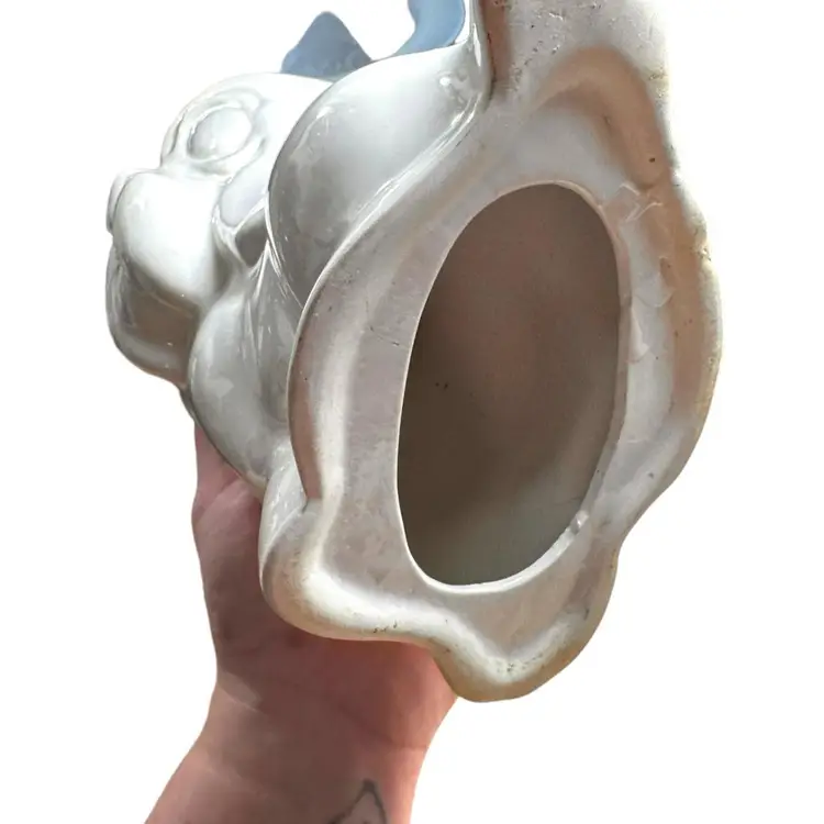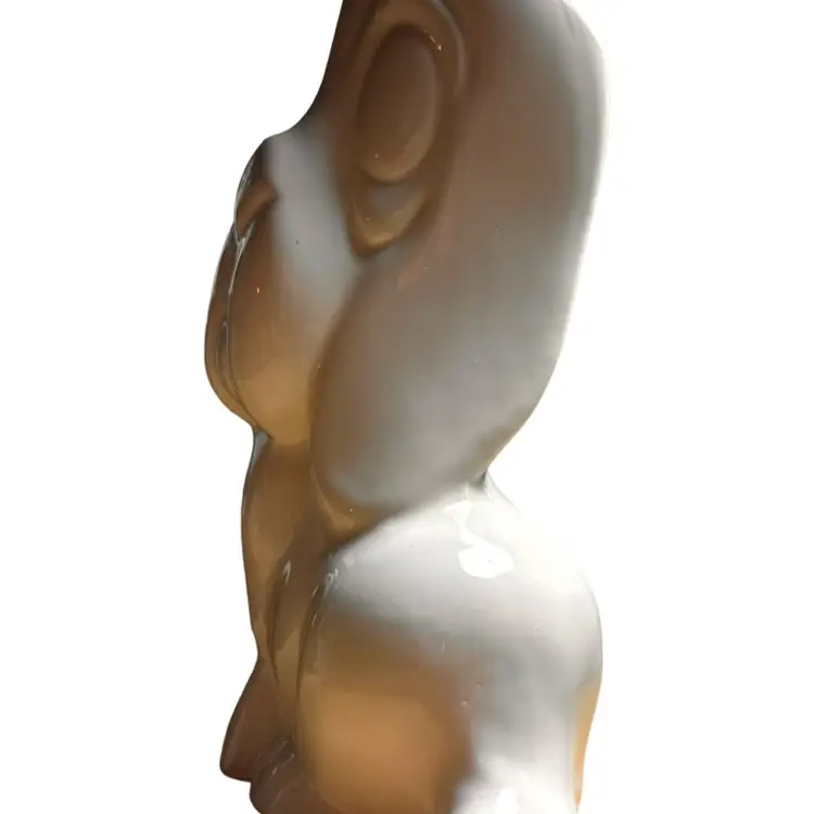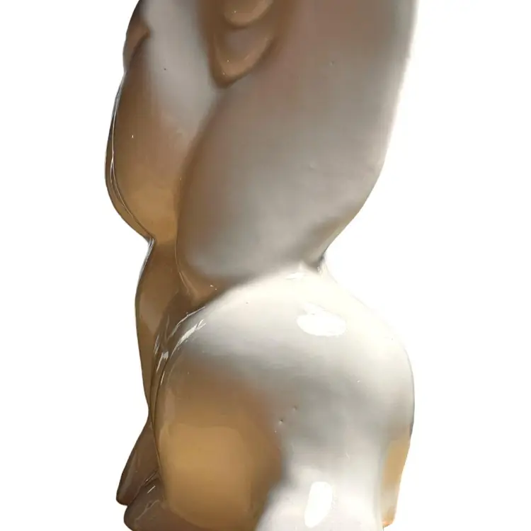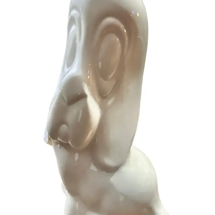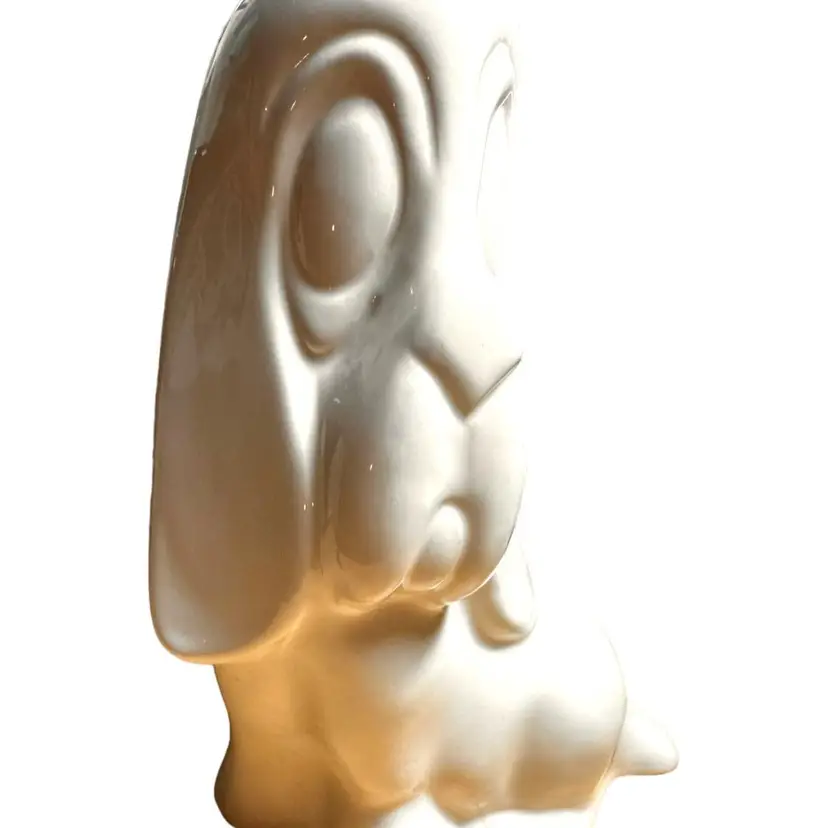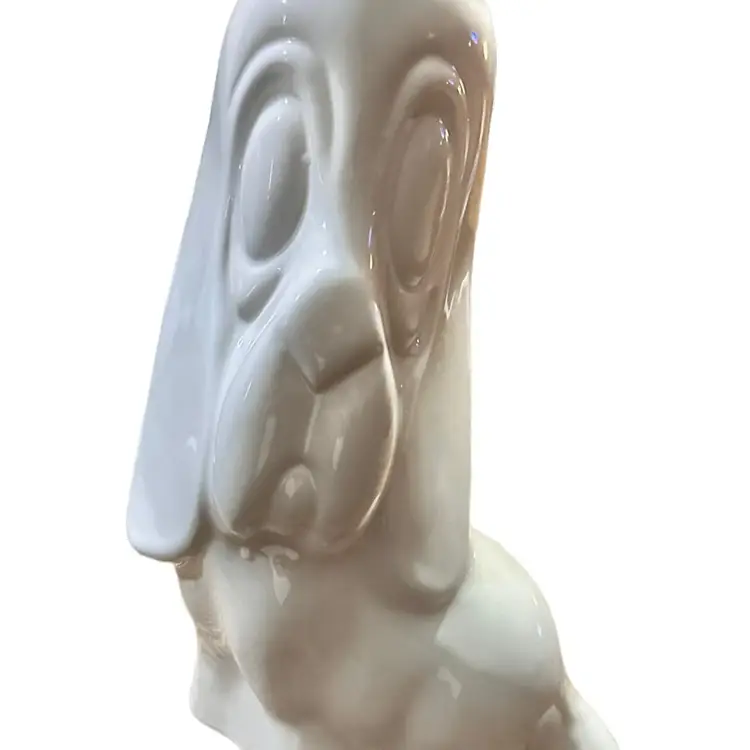 This Mid-Century Ceramic Basset Hound Figurine is an exquisite collectible for dog lovers. The figurine features a white hound dog with a sad and droopy expression, resembling Italian style Ahura sculpture almost exactly minus the gold gilt. One small chip on the underside of tail as pictured. No other flaws. Approximately 10.5" tall.