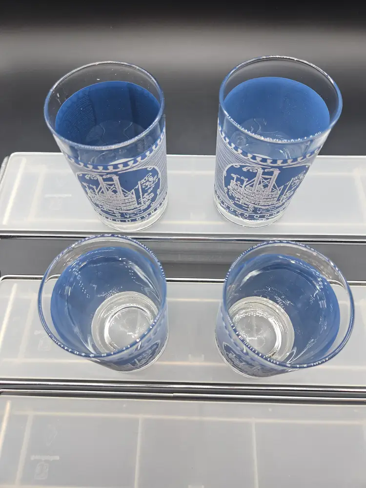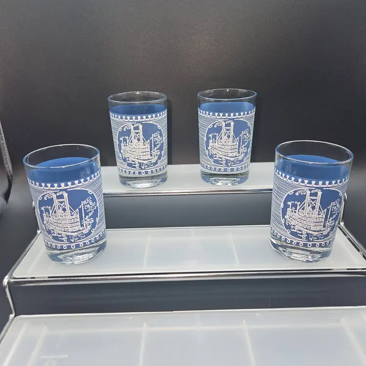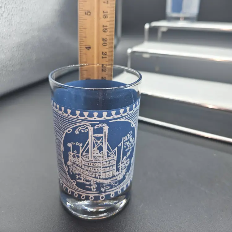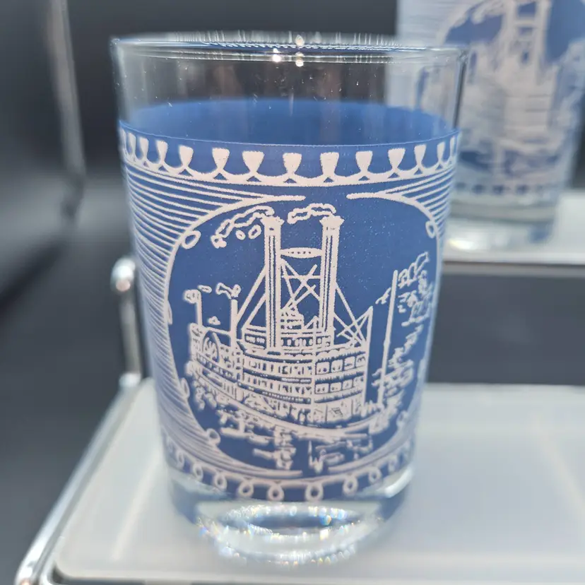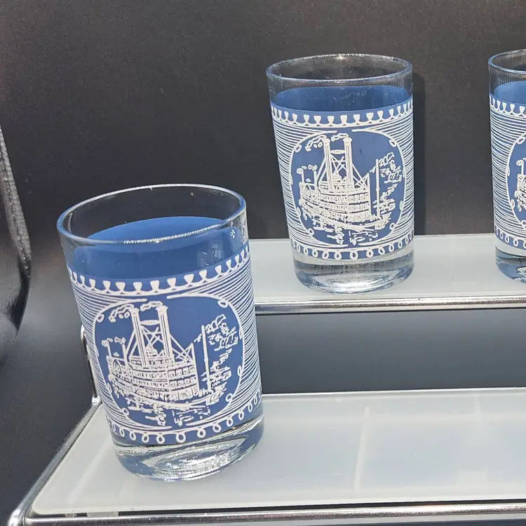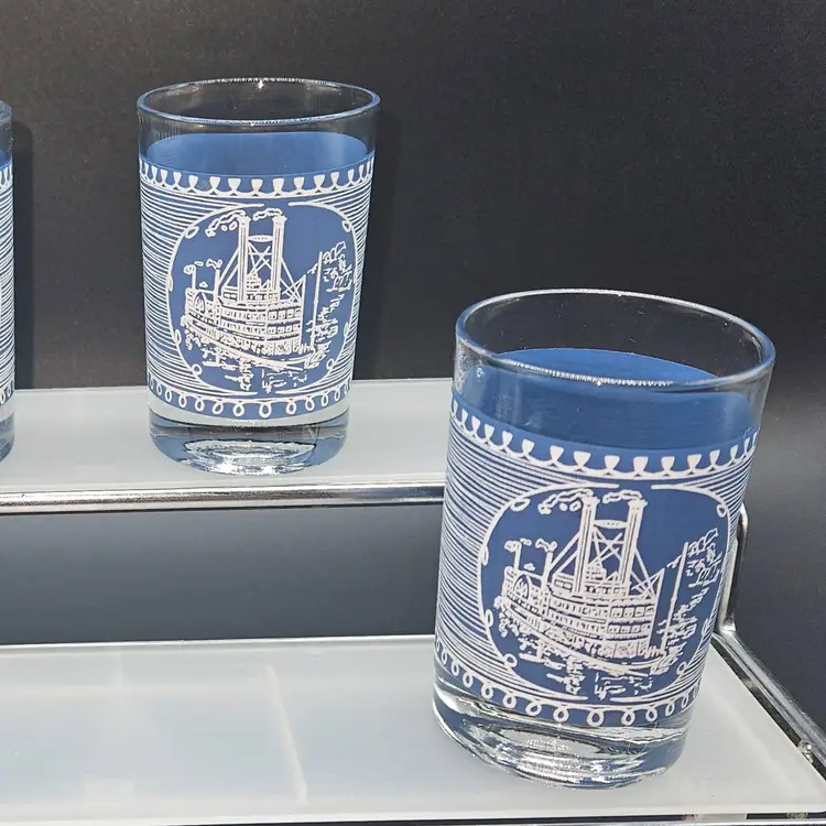 Elevate your drinkware collection with the Mid-Century Currier & Ives Steamboat Juice Glasses. Crafted from durable glass and adorned with the iconic Americana pattern, these rocks glasses are a testament to classic style and American heritage. Each glass has a 6 oz capacity, perfect for serving a variety of beverages, from fresh fruit juices to robust cocktails.