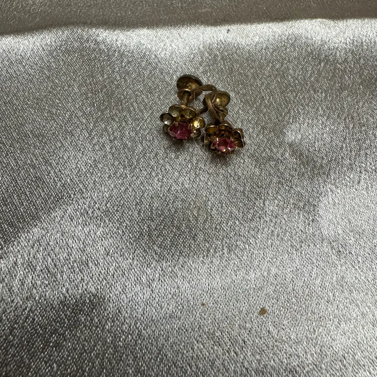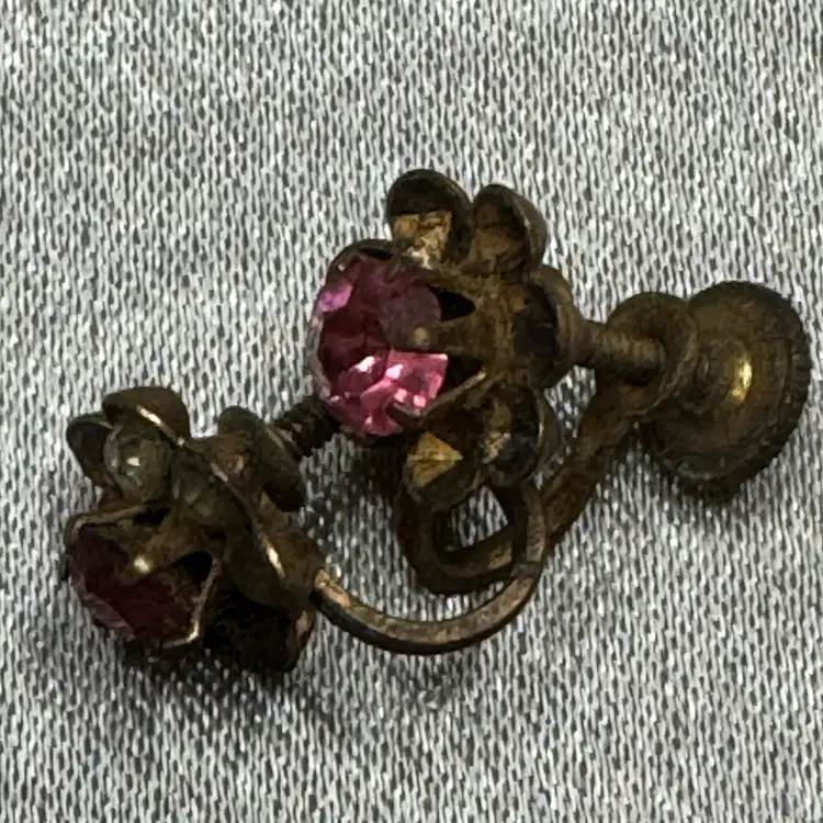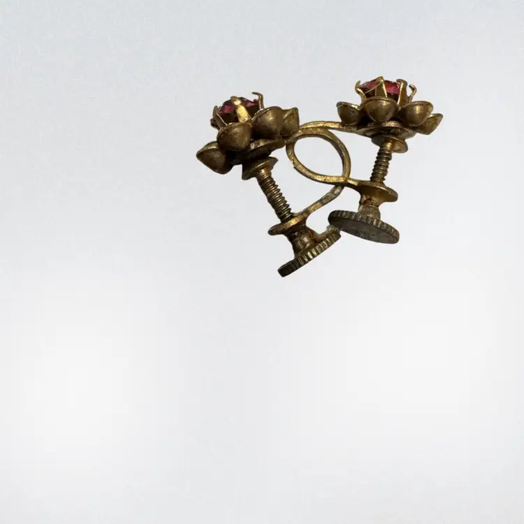 mid-century floral screw-back earrings (likely 1940s–1950s) made of a base metal like brass or gold-tone pot metal with faceted pink glass or rhinestone centers. • The metal shows significant patina and possible "greening" (verdigris), which is common in older costume jewelry. Stones are missing around both middle pink stones. But the middle pink stones are both in tact on both earrings. • Closure Type: Screw-backs were most popular from the 1920s through the early 1950s. After that, clip-ons became the standard until pierced ears regained popularity in the 70s. This "vintage" appeal is a selling point. • Material: These are likely costume jewelry.