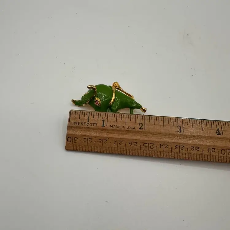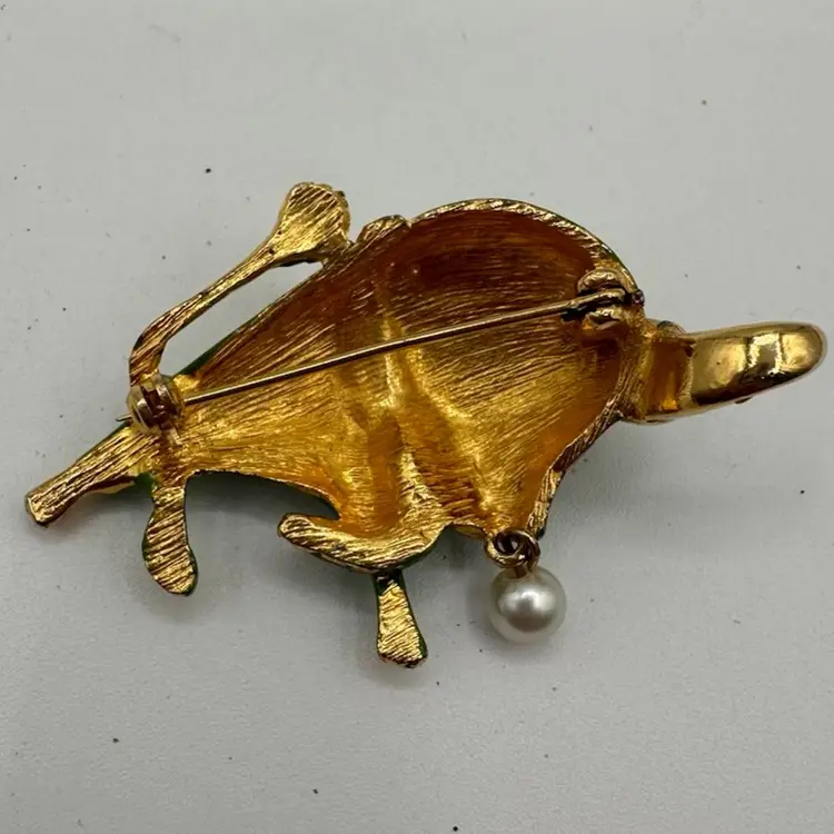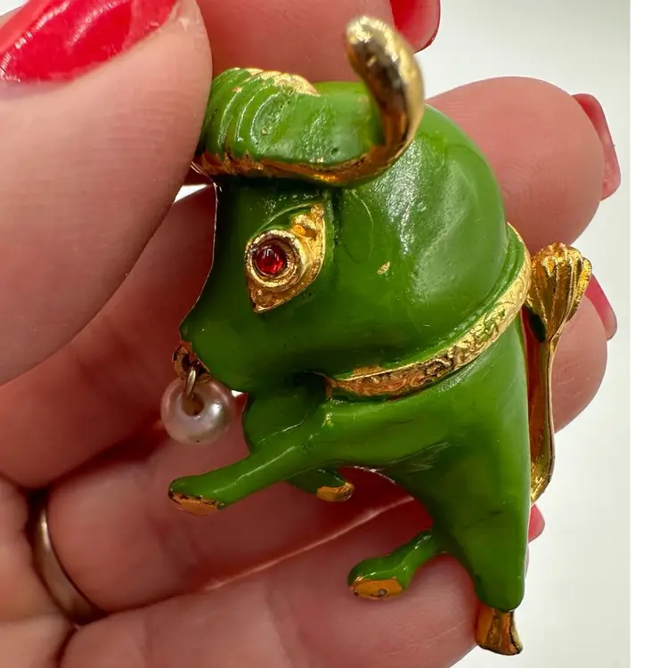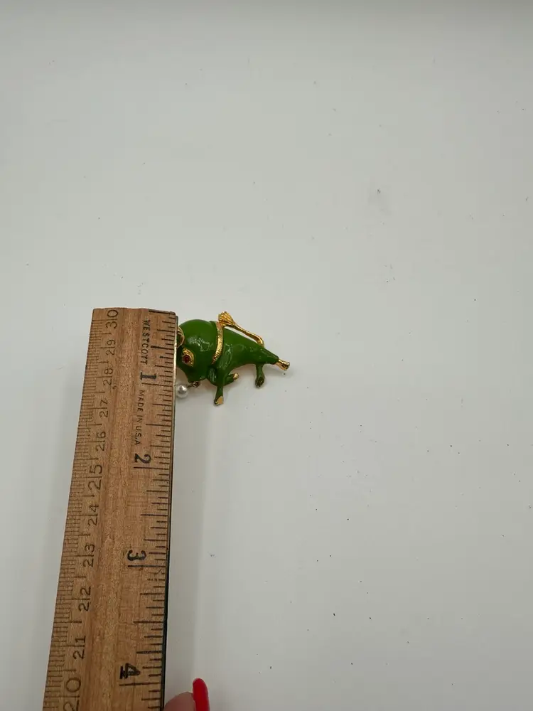 Mid century gold and green enamel brooch, has a pearl and a red rhinestone for an eye . A lot of beauty packed into this guy . It’s not signed, in great condition with one small tiny little paint chip . 2x1