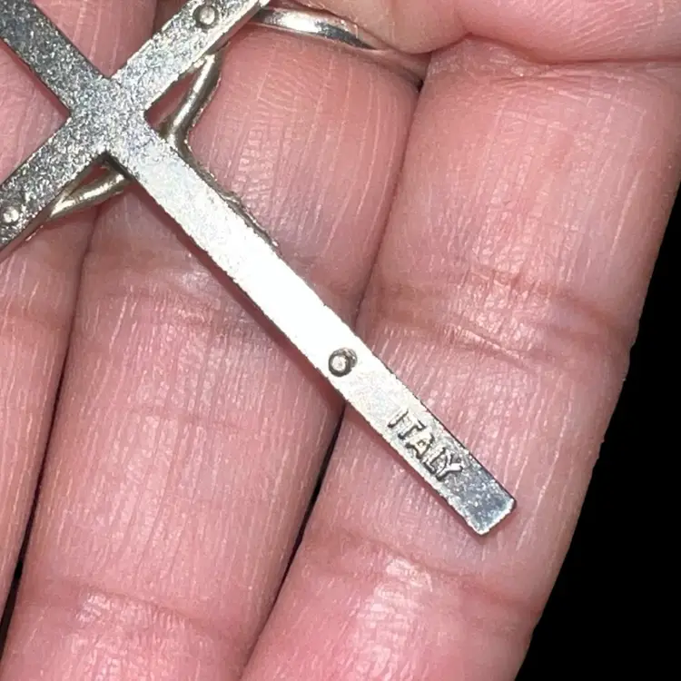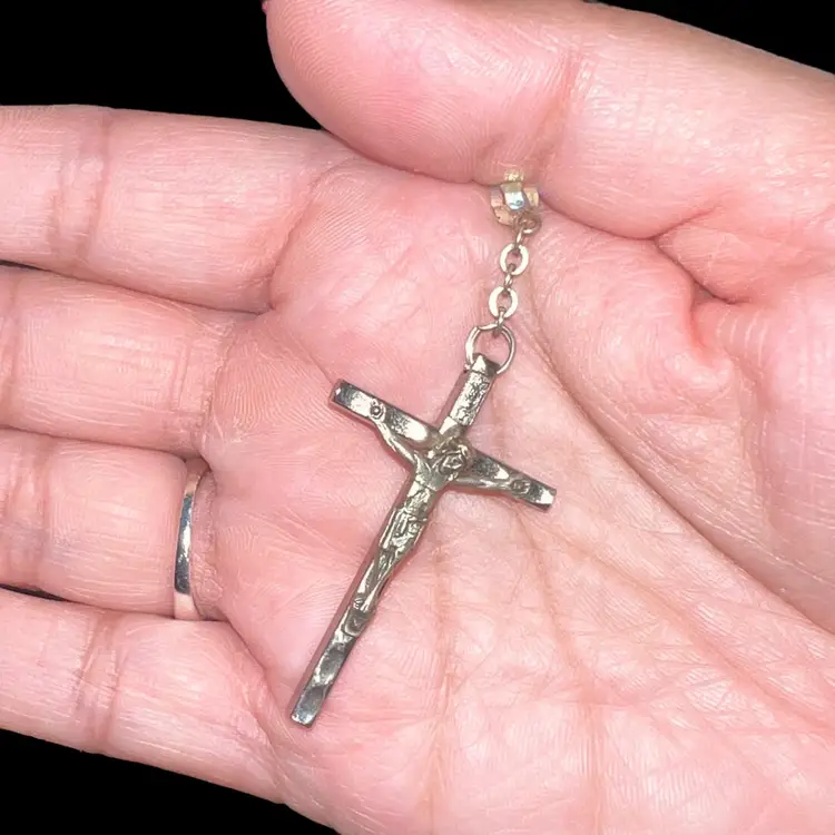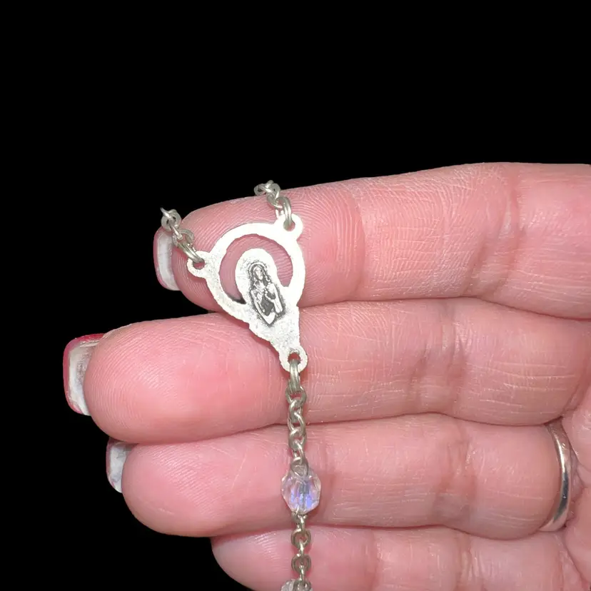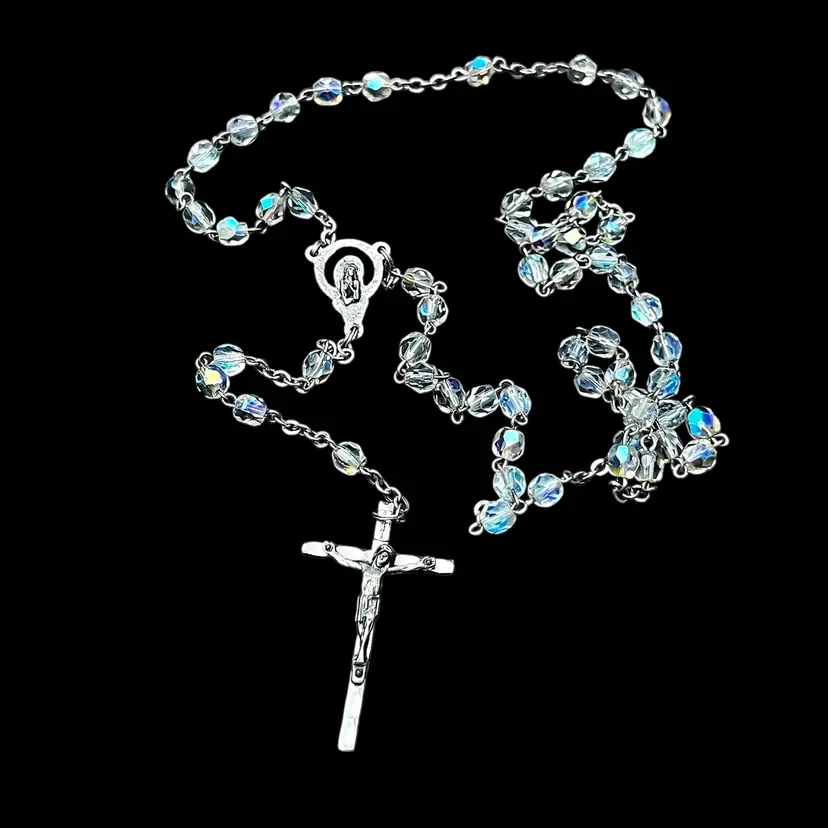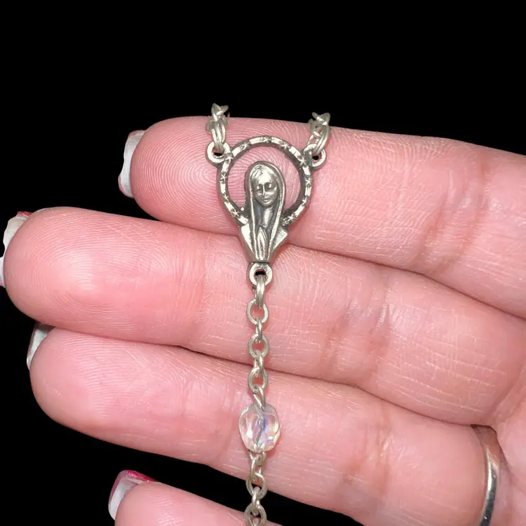 This beautiful vintage rosary is an elegant devotional piece from mid-century Italy, featuring shimmering aurora borealis faceted glass beads and a silver tone crucifix marked Italy. The iridescent beads catch the light with subtle rainbow hues, giving this piece both reverence and charm. • Era: Mid-Century (c. 1950s–1960s) • Origin: Italy (crucifix stamped Italy) • Material: Silver tone metal with aurora borealis crystal beads • Length: ~17” drop | 24” total necklace circumference • Condition: Excellent vintage condition with no chips, cracks, or damage.