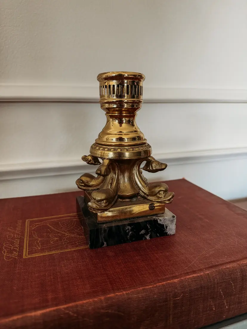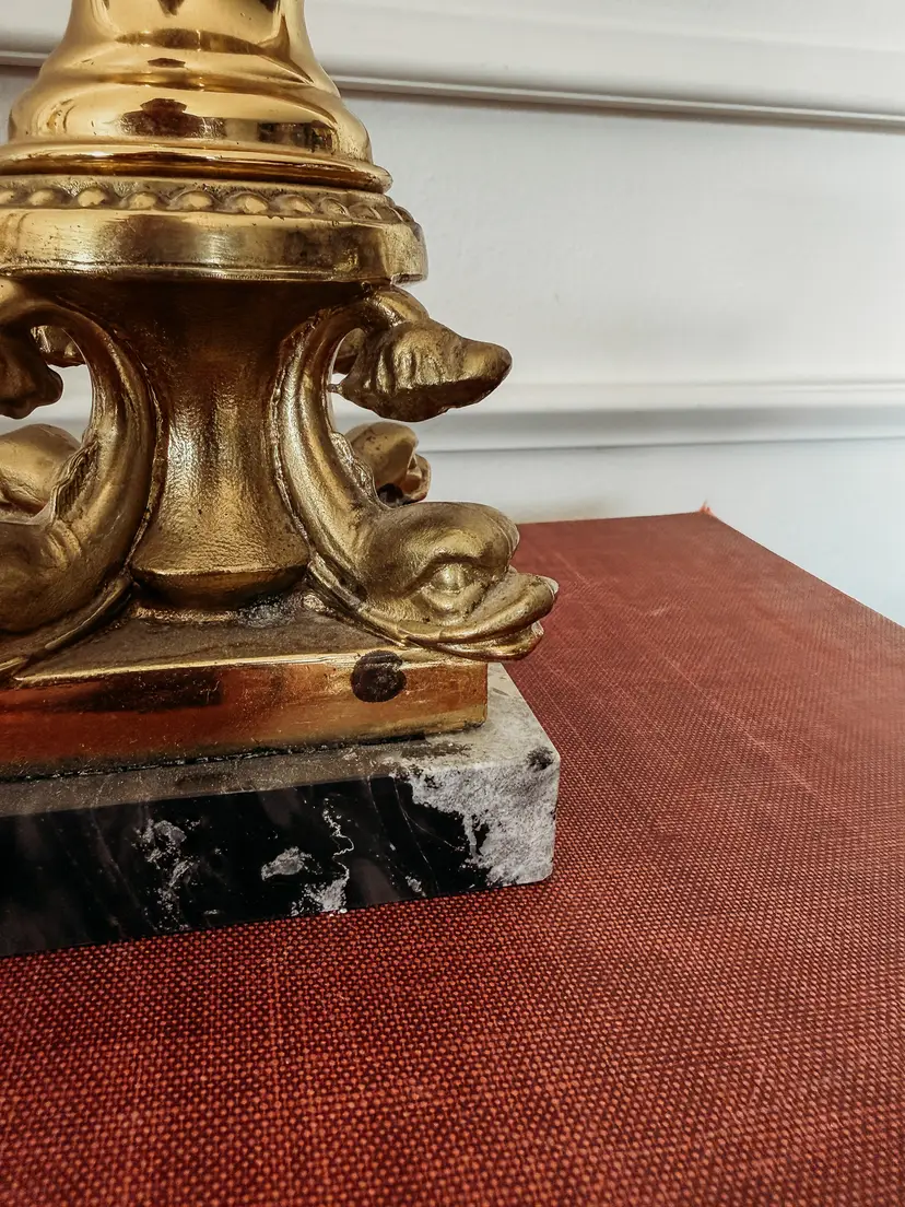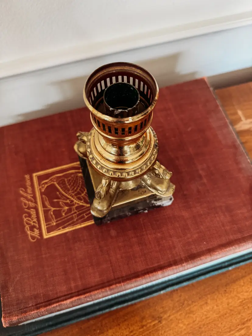 Meant to use a glass shade/hurricane, but also looks great with only a taper candle. Part of The Rural Legend's personal collection. Stunning marble and brass piece! Very heavy and some tarnish on the brass. 6.5" tall
