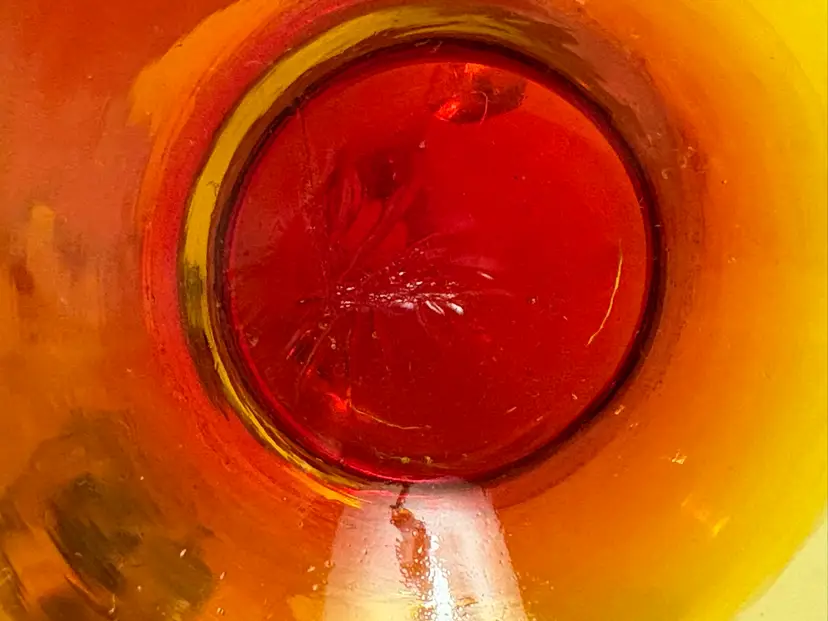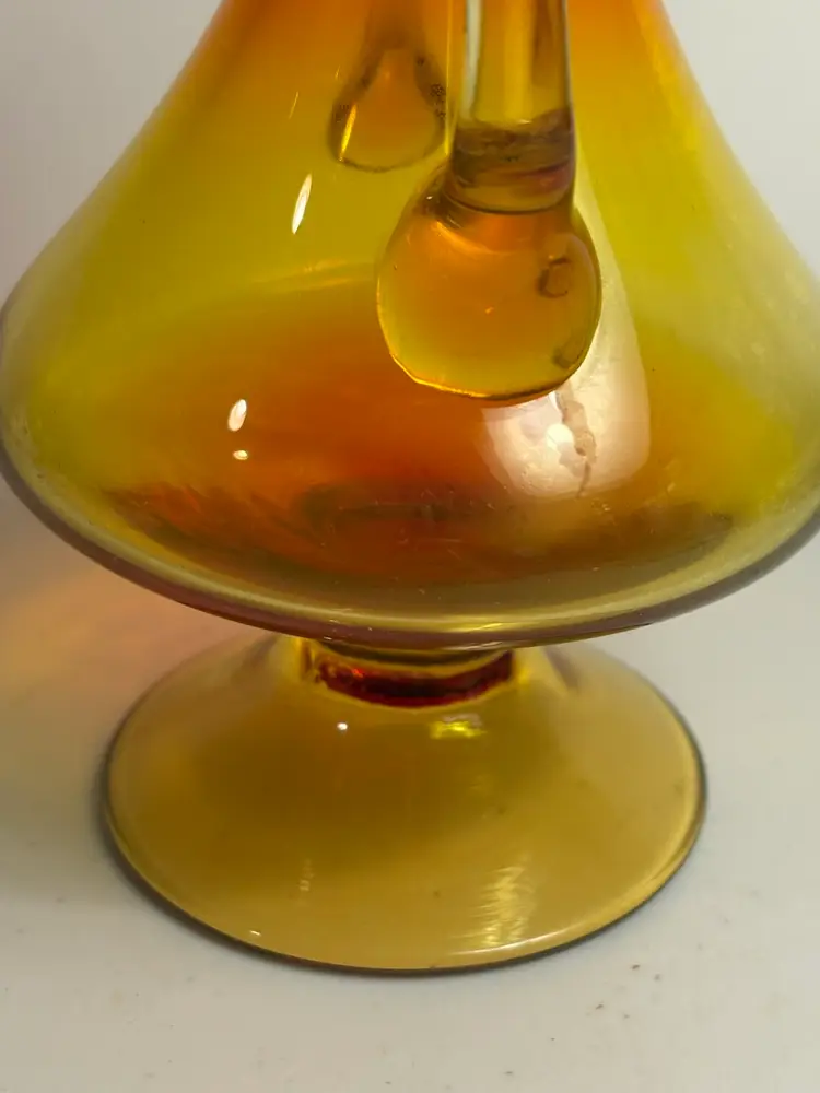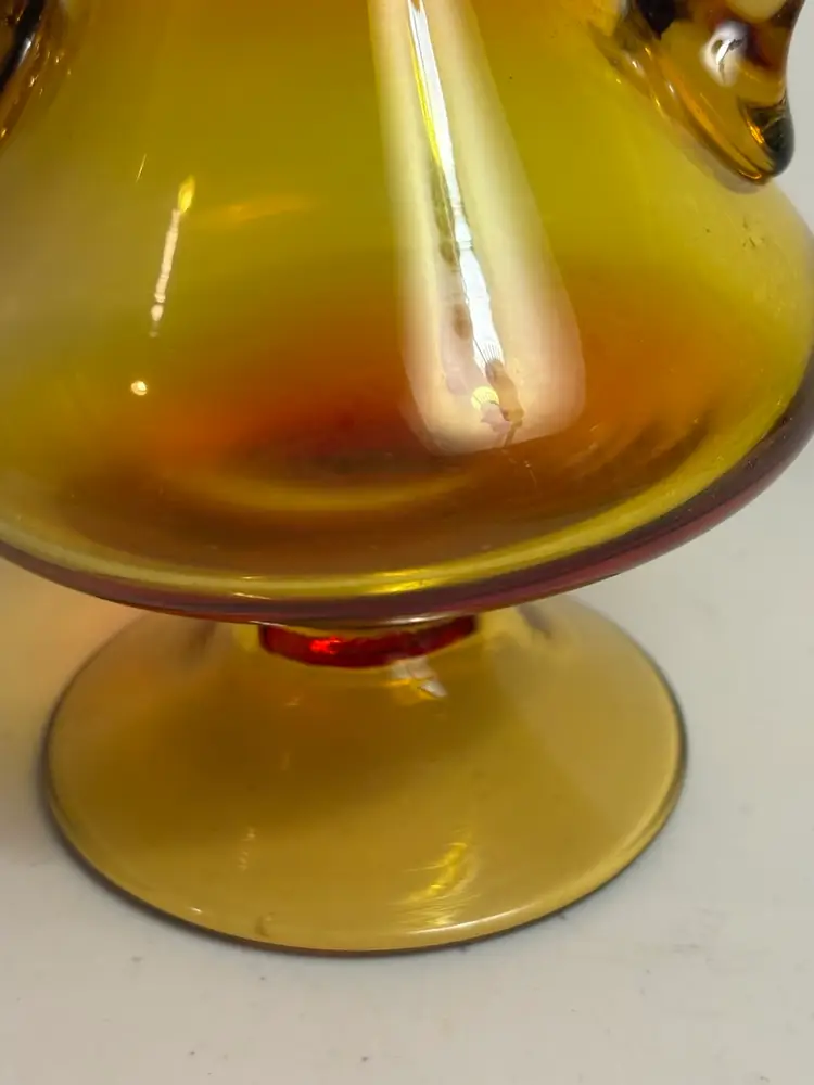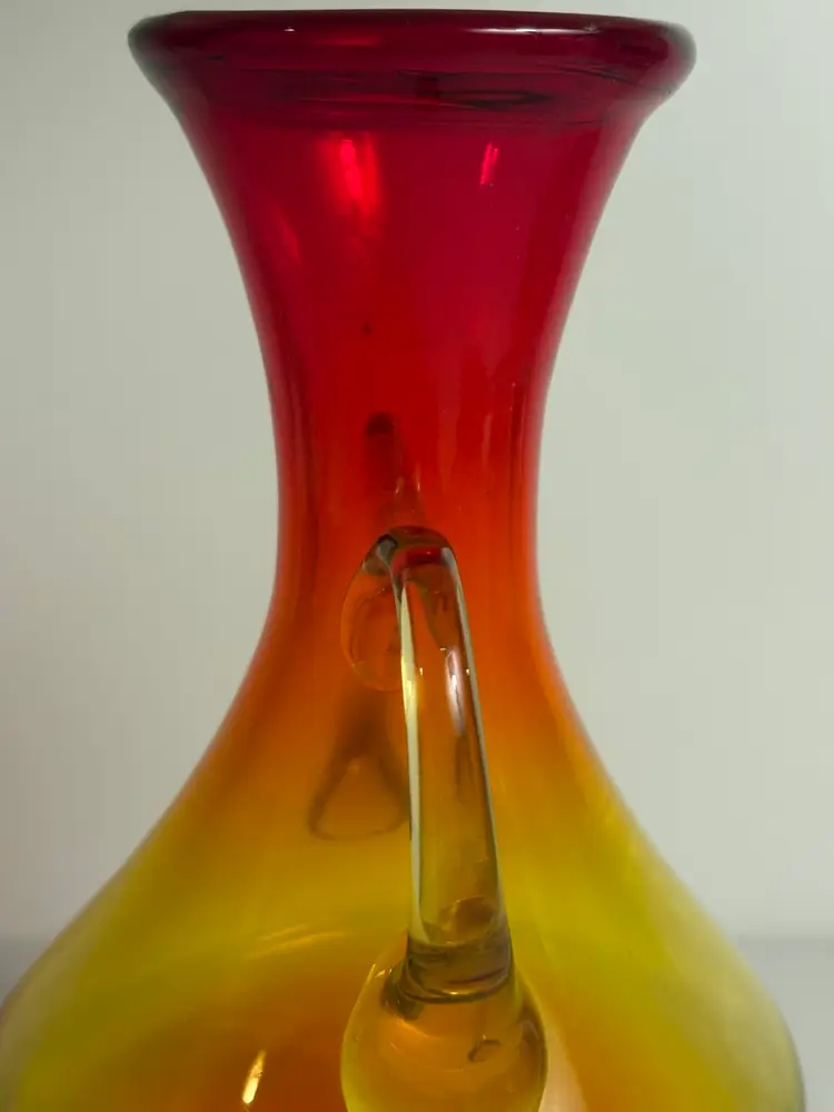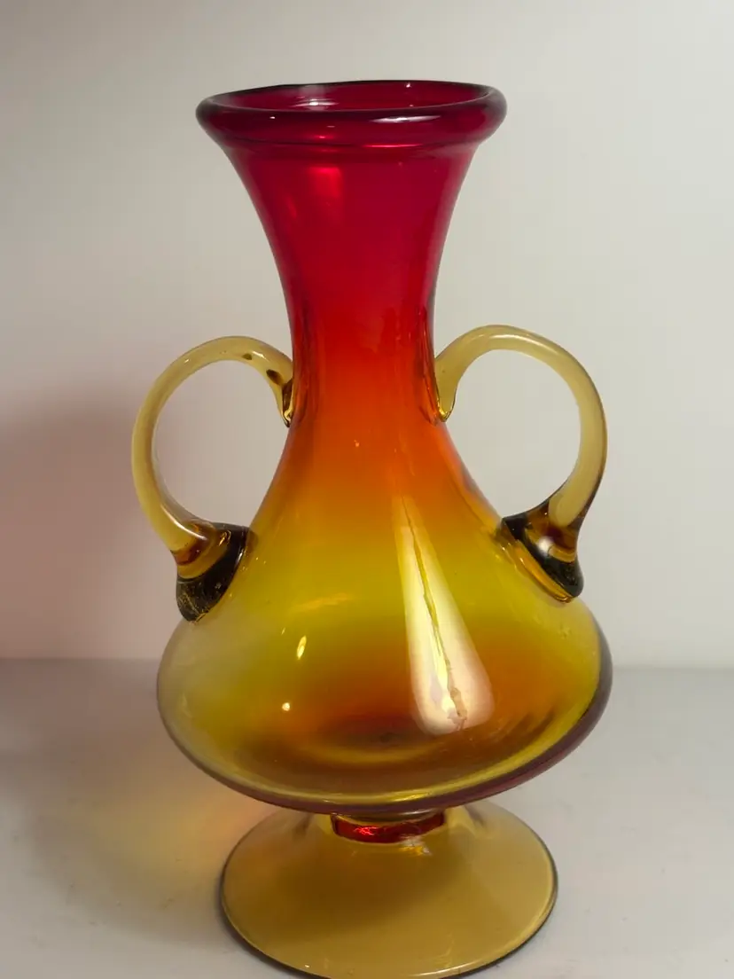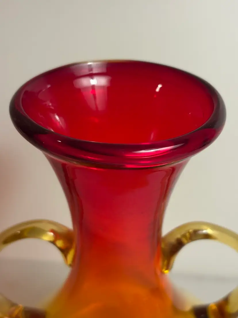 The product is a vintage Mid-century modern amberina handled glass vase. This stylish vase showcases the iconic design and craftsmanship of the mid-20th century, featuring a sleek and elegant shape with a unique amberina color. Made of high-quality glass, this vase is a perfect addition to any collection of decorative pottery and glassware, adding a touch of retro charm to any home or space.