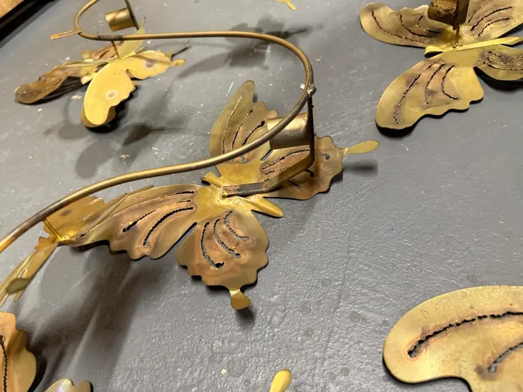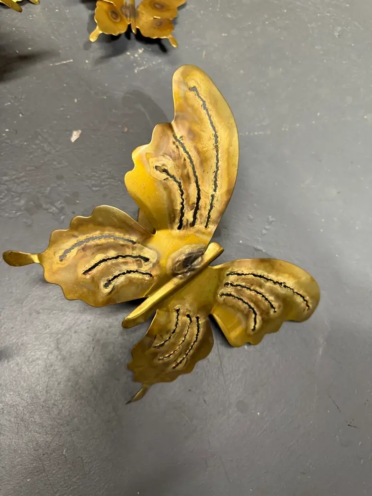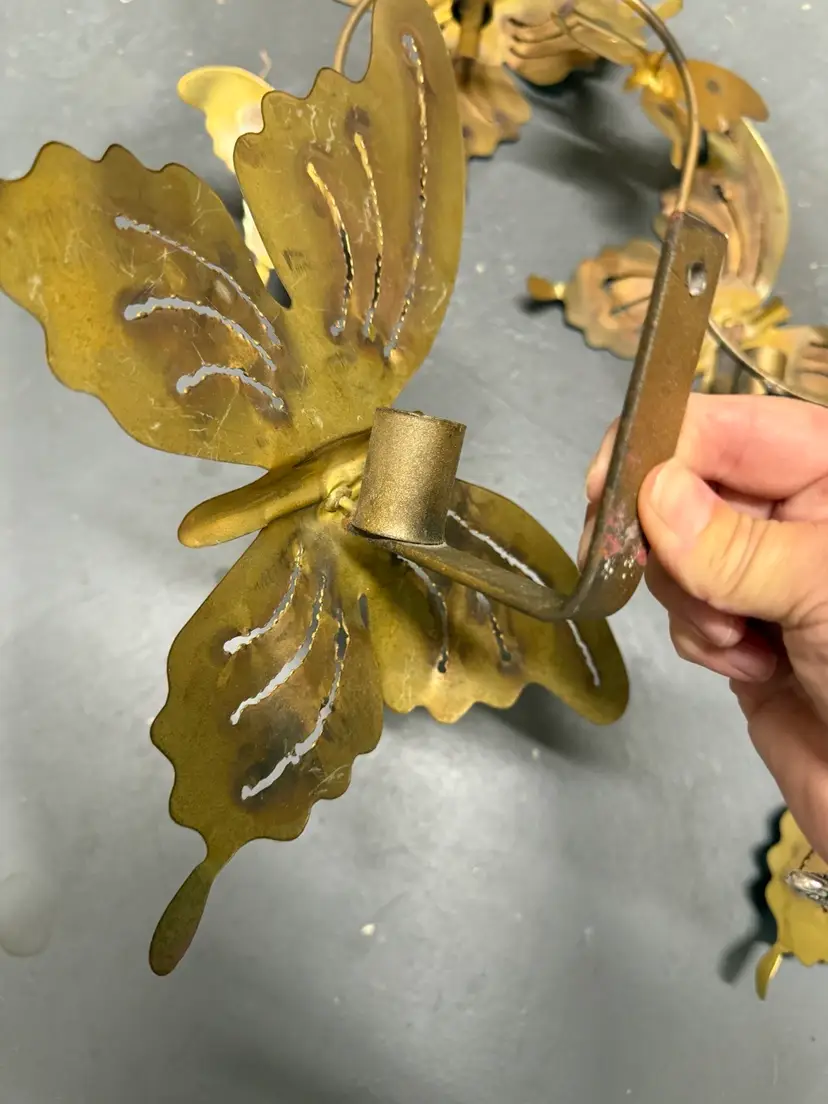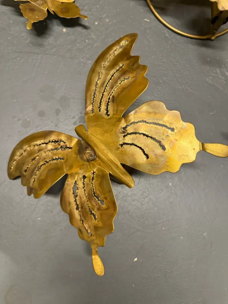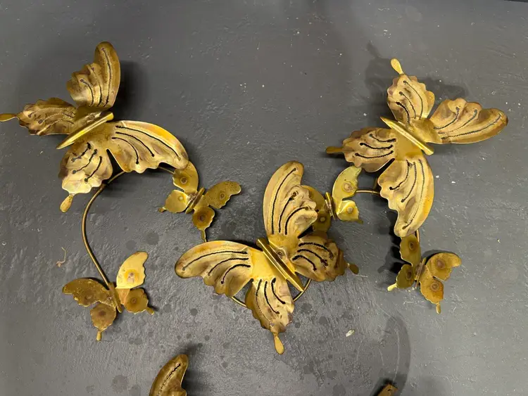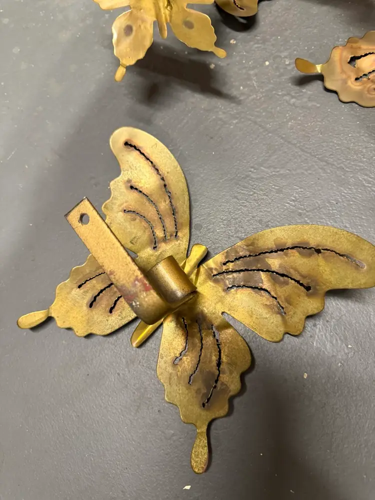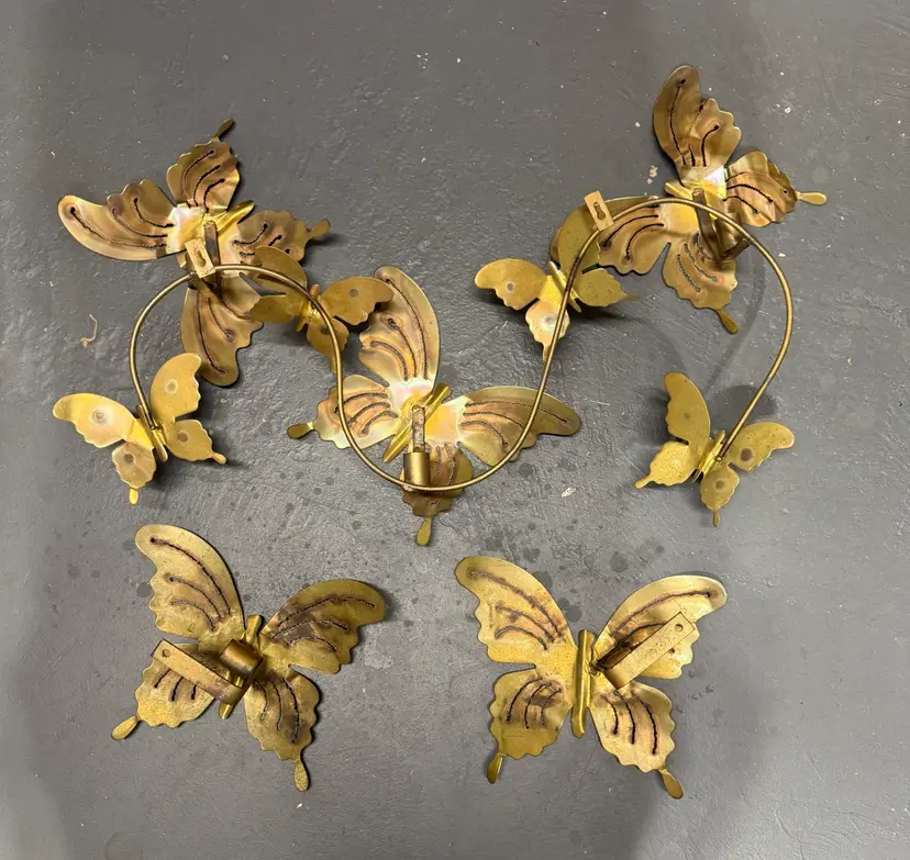 Mid Century Modern Butterflies Large 3 Candle Wall Sconce Jere Style. 3 piece Art Work Wall Hanging this beautiful brass wall candle sconce features seven (7) butterflies with three (3) candle holding slots and  two individual butterflies with candleholders. Measures approximately 32” long x 20” tall and has two solid loops for hanging. The two individual butterflies measure 11“ x 8“ In very nice condition