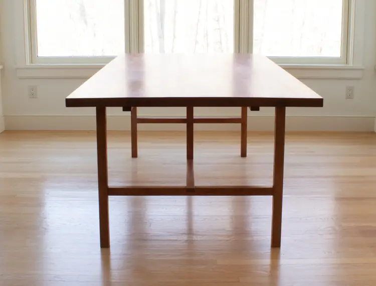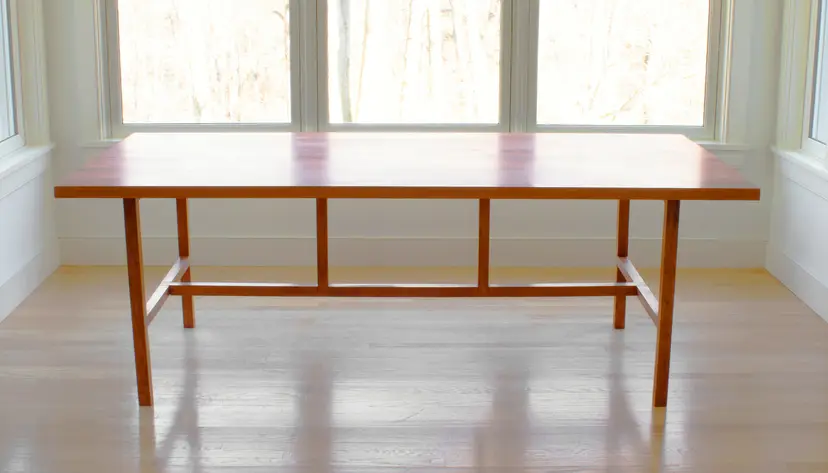 This Mid-century modern table with straight components and stretchers that forms crisp shadow lines and add strength. Top is 1¼ - 1½″ thick. Four legs plus a center stretcher allow flexible seating: The 84″ seats 8, 96″ seats 10. Finished with four coats of hand-rubbed varnish or urethane.