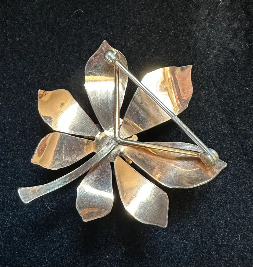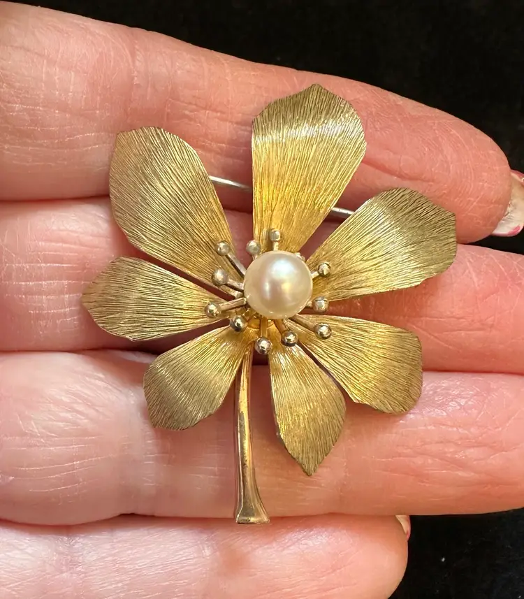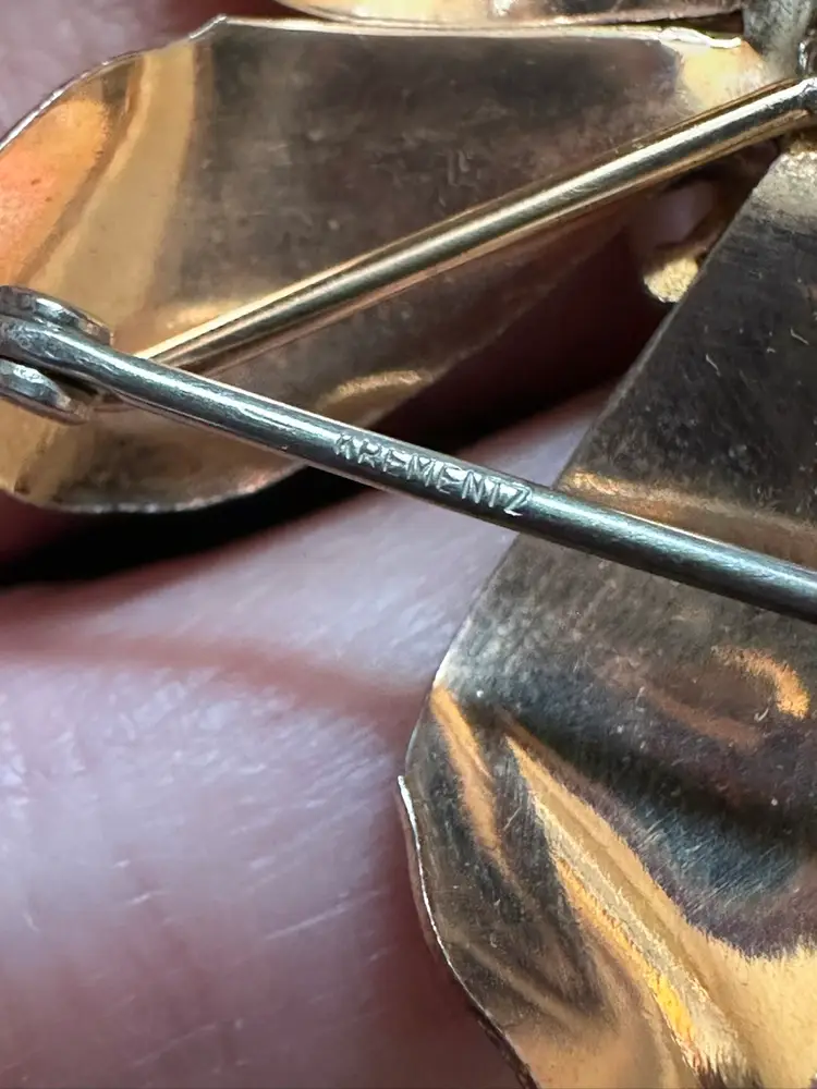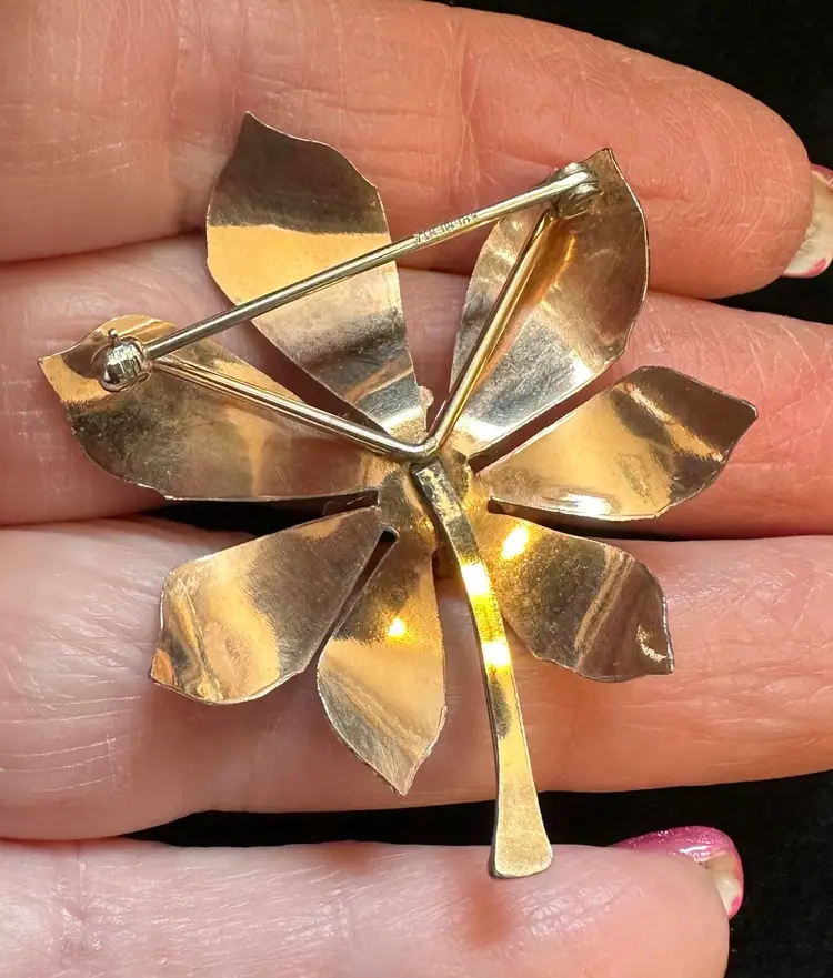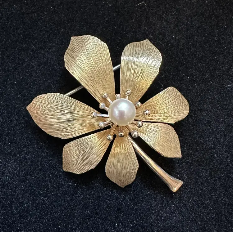 Lovely classic mid century modern brooch by Krementz. It has a floral design with a cultured pearl accent. The finish is a yellow gold overlay. It measures 1 7/8 at widest point. Condition is very good.