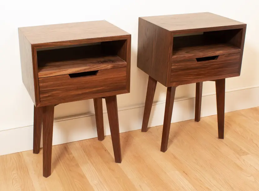 Mid Century Modern inspired side table for your living room, study, or bedroom as a night table. The table features continuous grain from left side to top to the right side/ The legs are tapered and skewed for a graceful appearance. The solid wood drawer has a featured hardwood front and maple interior. Finished with 3 coats of hand rubbed varnish finish with paste wax.