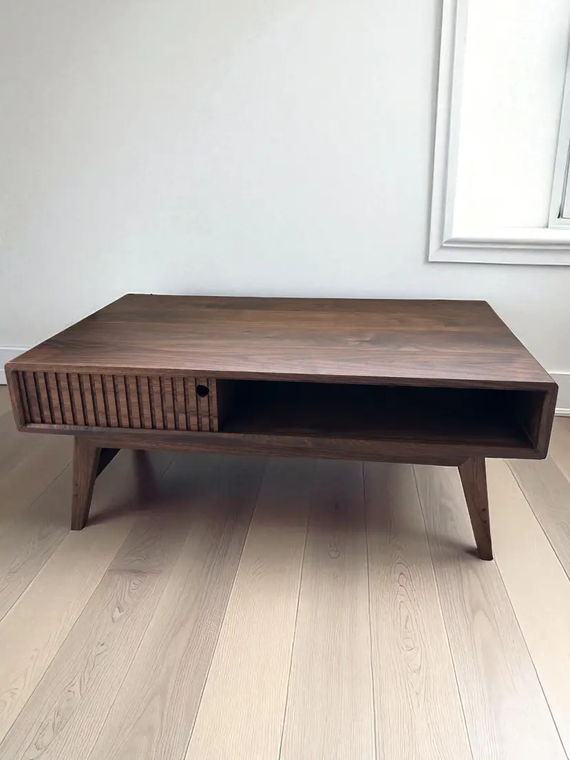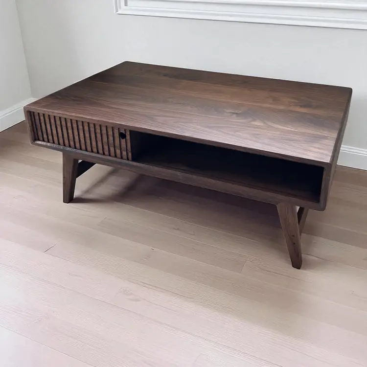 Elevate your living space with this handcrafted mid-century modern coffee table. Made from rich walnut, it features a sleek design with a slatted sliding drawer for a touch of retro charm. Perfect for adding style and functionality to your living room. The dimensions of these tables are 36x22 inch table tops, and 18 inch height. Finished with Rubio Monocoat, a very durable hard wax oil.