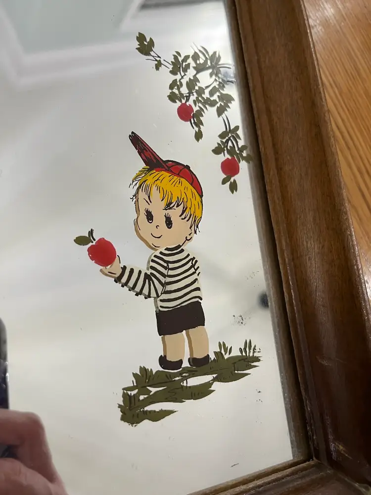 Decorative mirrors like this, often featuring whimsical or charming illustrations, became popular as home decor items throughout the mid-20th century. They were typically mass-produced and intended to add a touch of personality to children's rooms or casual living spaces. The style of the illustration, with its bold lines and cheerful depiction of a child, is characteristic of the era's popular cartoon art.