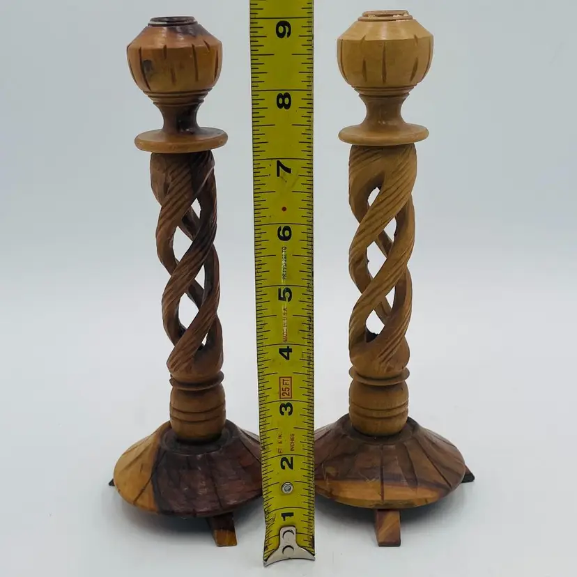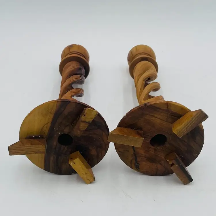 These beautiful hand carved candle stick holders are made from olive wood and have an artsy, boho flavor! The stems of these are carved from one piece of wood. Hollowed out to appear like a braid. They are just over 9" tall.