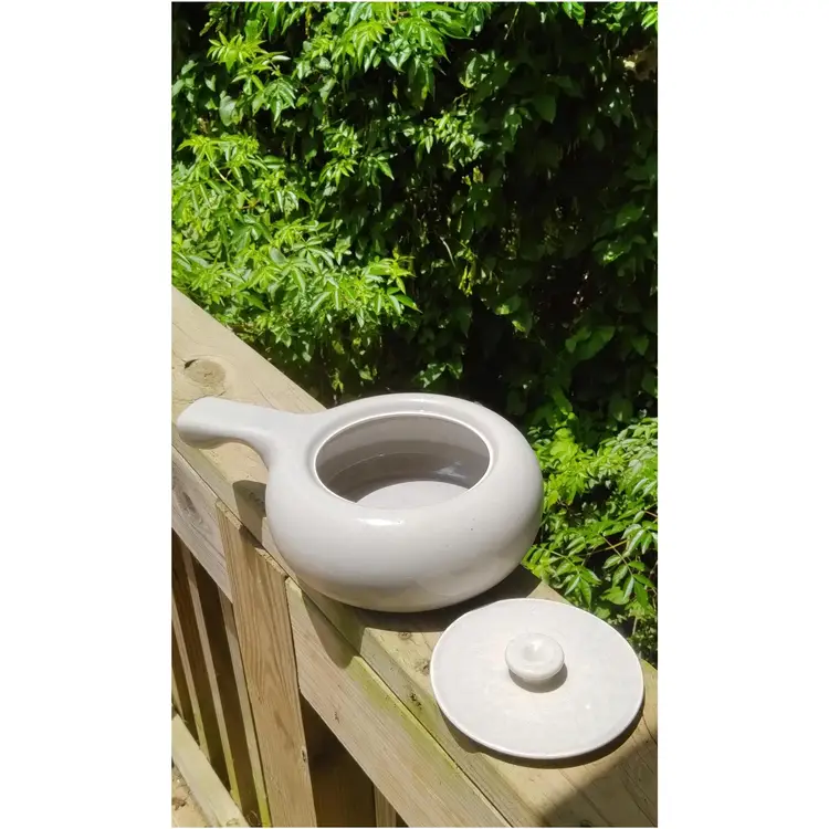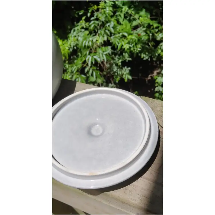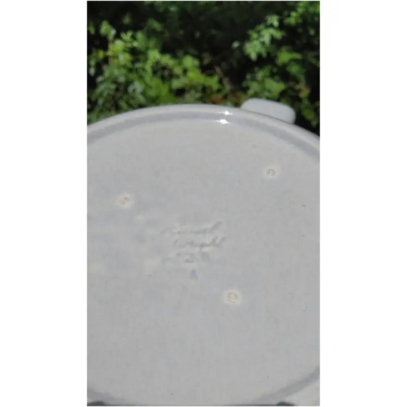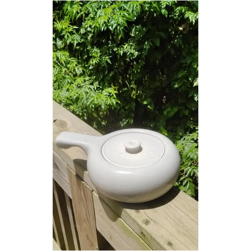 This is signed by Russel Wright and is grey with grey specks. It was intended to be taken straight from the oven to the table. It's in great condition.