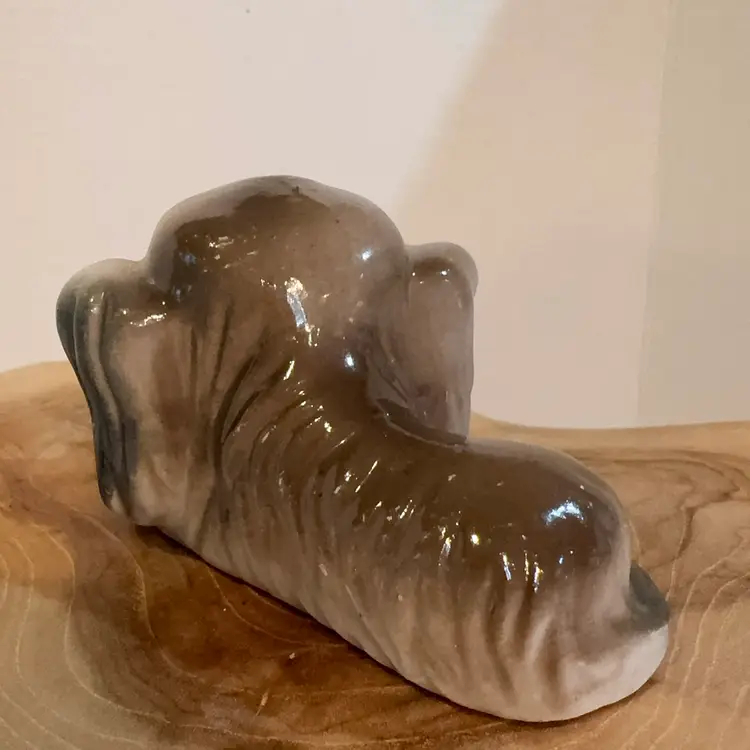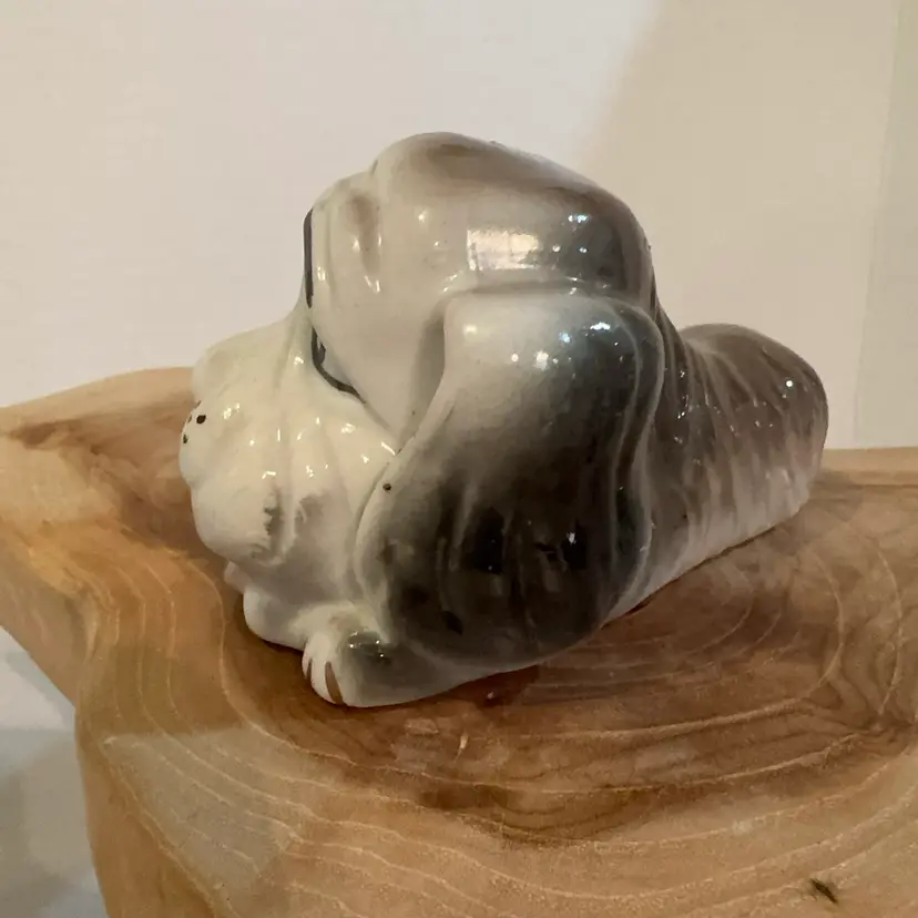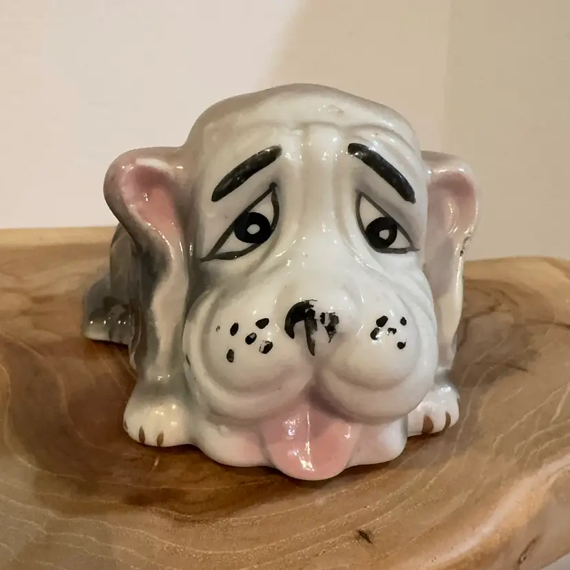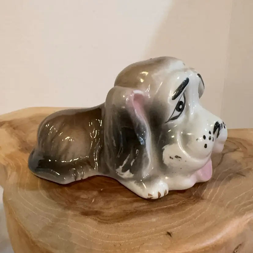 Adorable vintage mid-century Japanese ceramic “sad-eye” puppy figurine featuring expressive droopy eyes, soft gray shading, and tongue-out detail. Classic 1950s–60s export décor piece. Approximately 4 inches long. Very nice vintage condition with minimal paint loss, considering age.